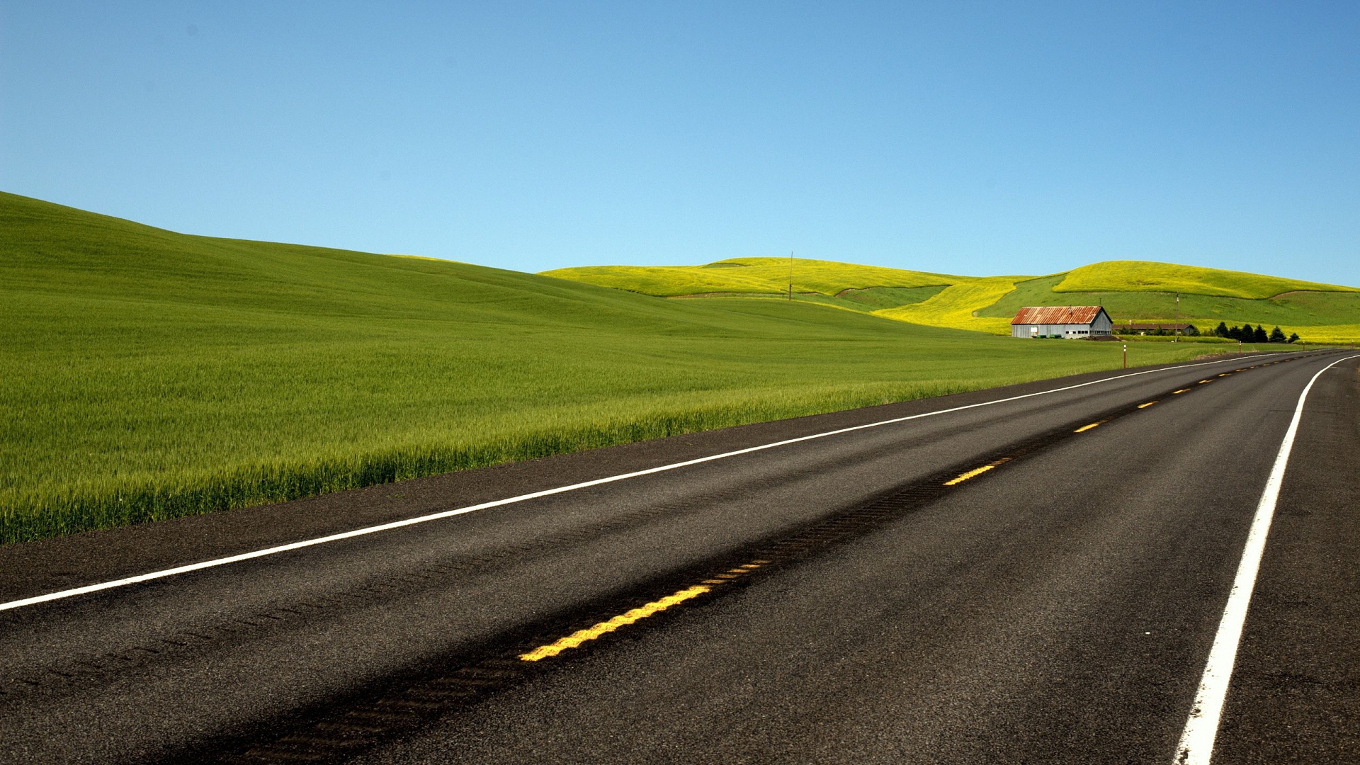 Description: A road with a house on the side of it in the middle of a green field with a blue sky.