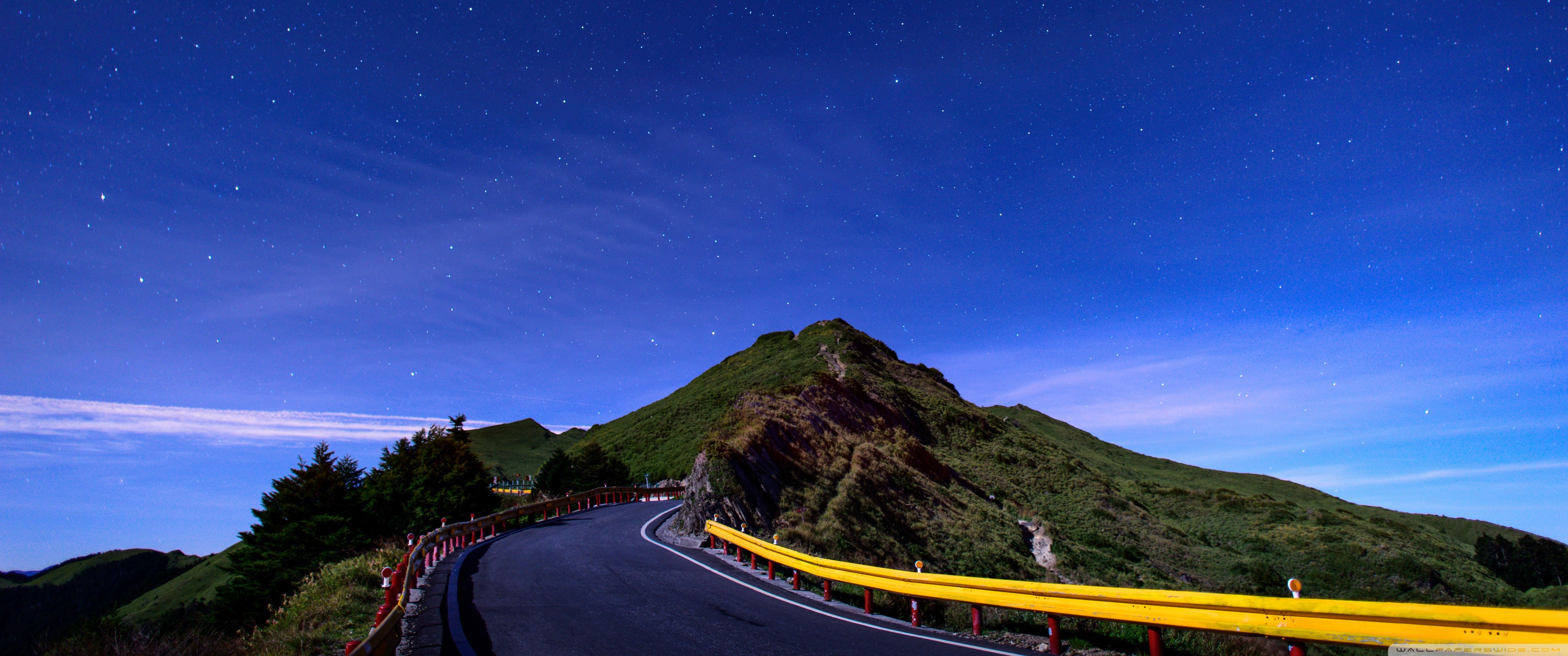 Description: A road with a mountain in the background and a blue sky with stars above it and a yellow fence on the side.