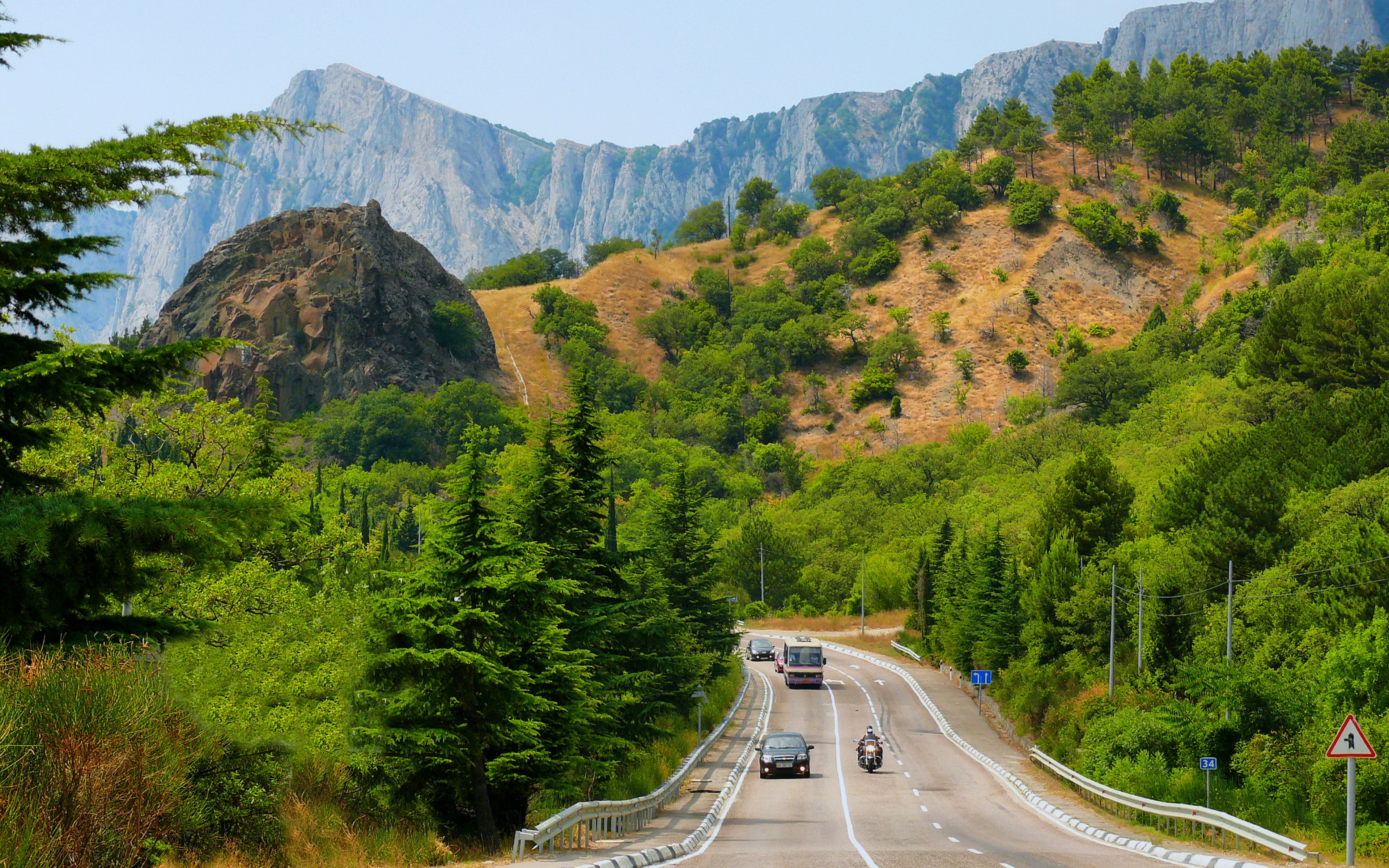Description: A road with a mountain in the background and cars driving on it.