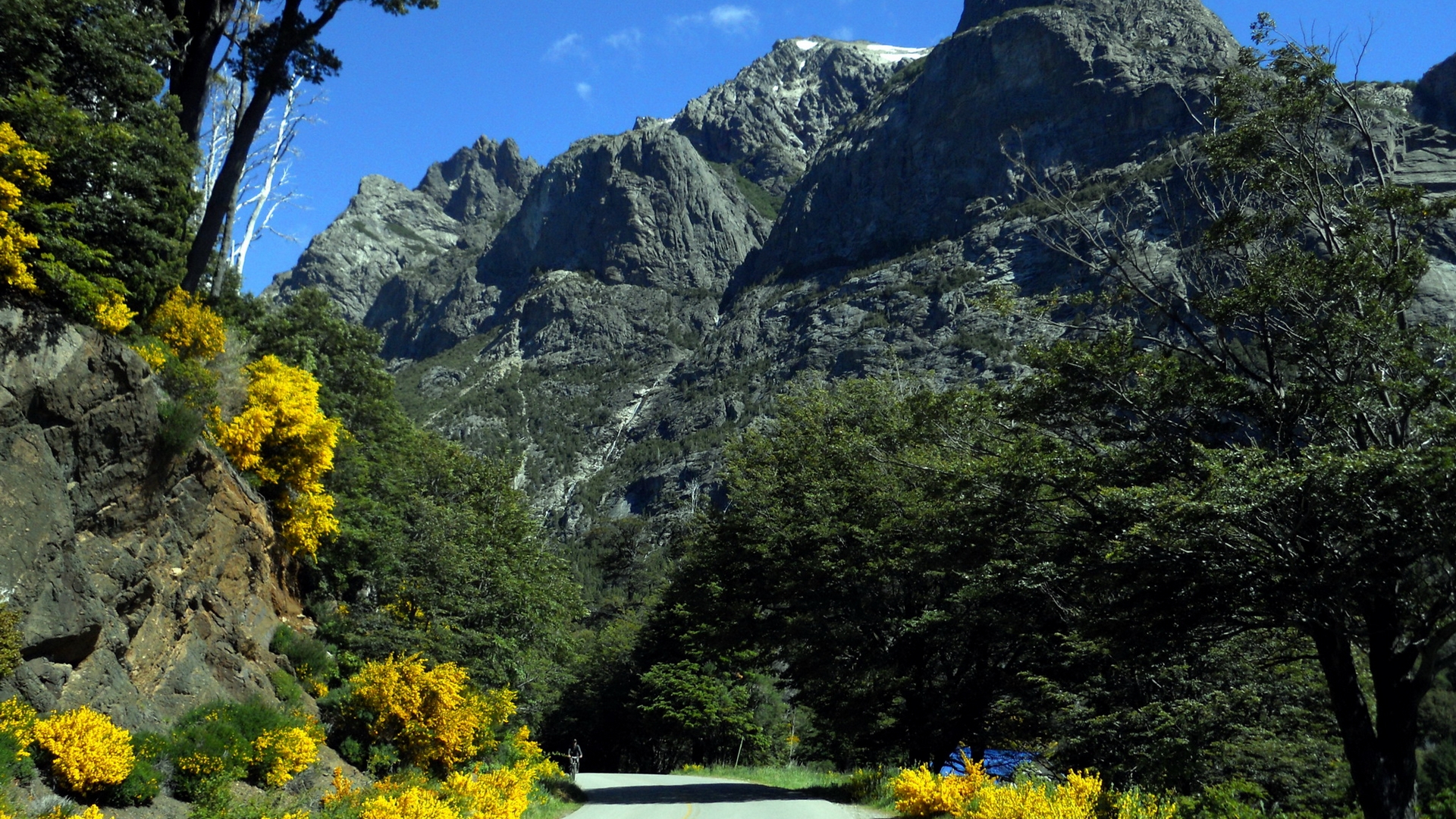Description: A road with a mountain in the background and yellow flowers on the side of it and trees on the side.