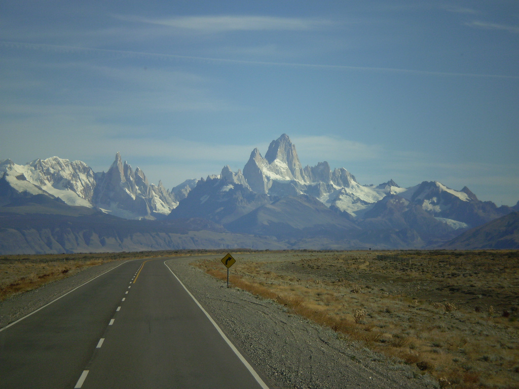 Description: A road with a sign on the side of it in the middle of nowhere with mountains in the background.