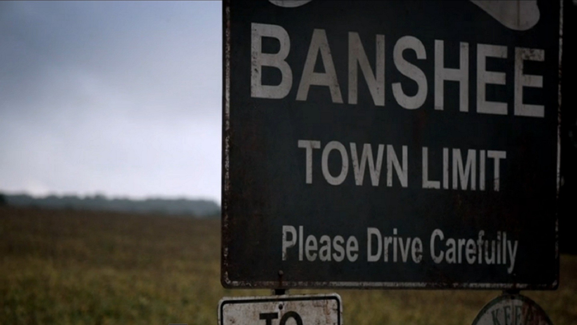 Description: A sign that is on the side of a road in the grass with a sky background and a field with grass and trees.