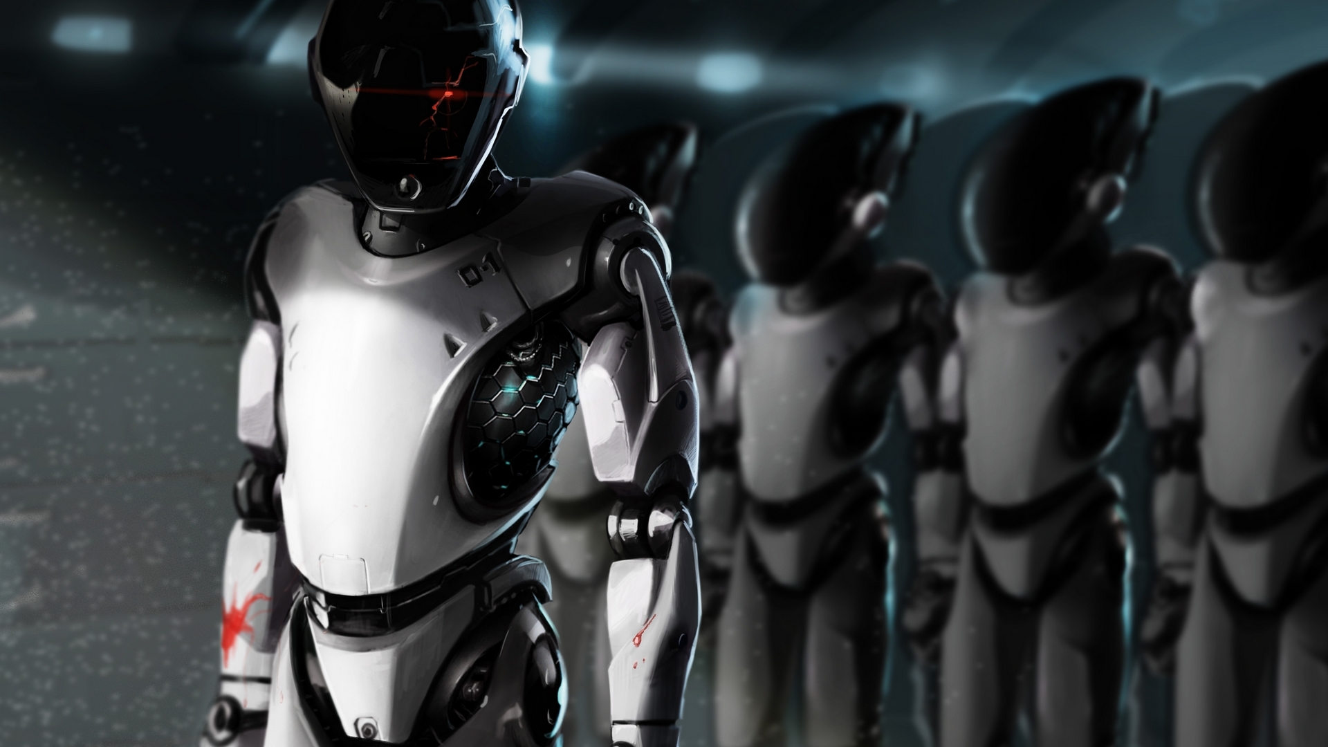 Description: A robot standing in front of a group of mannequins in a room with a dark background.