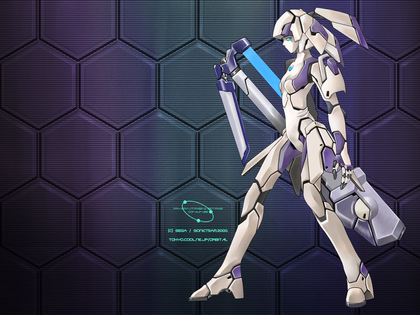 Description: A robot with a briefcase and a sword in his hand and a purple background with he is holding a blue and white object.