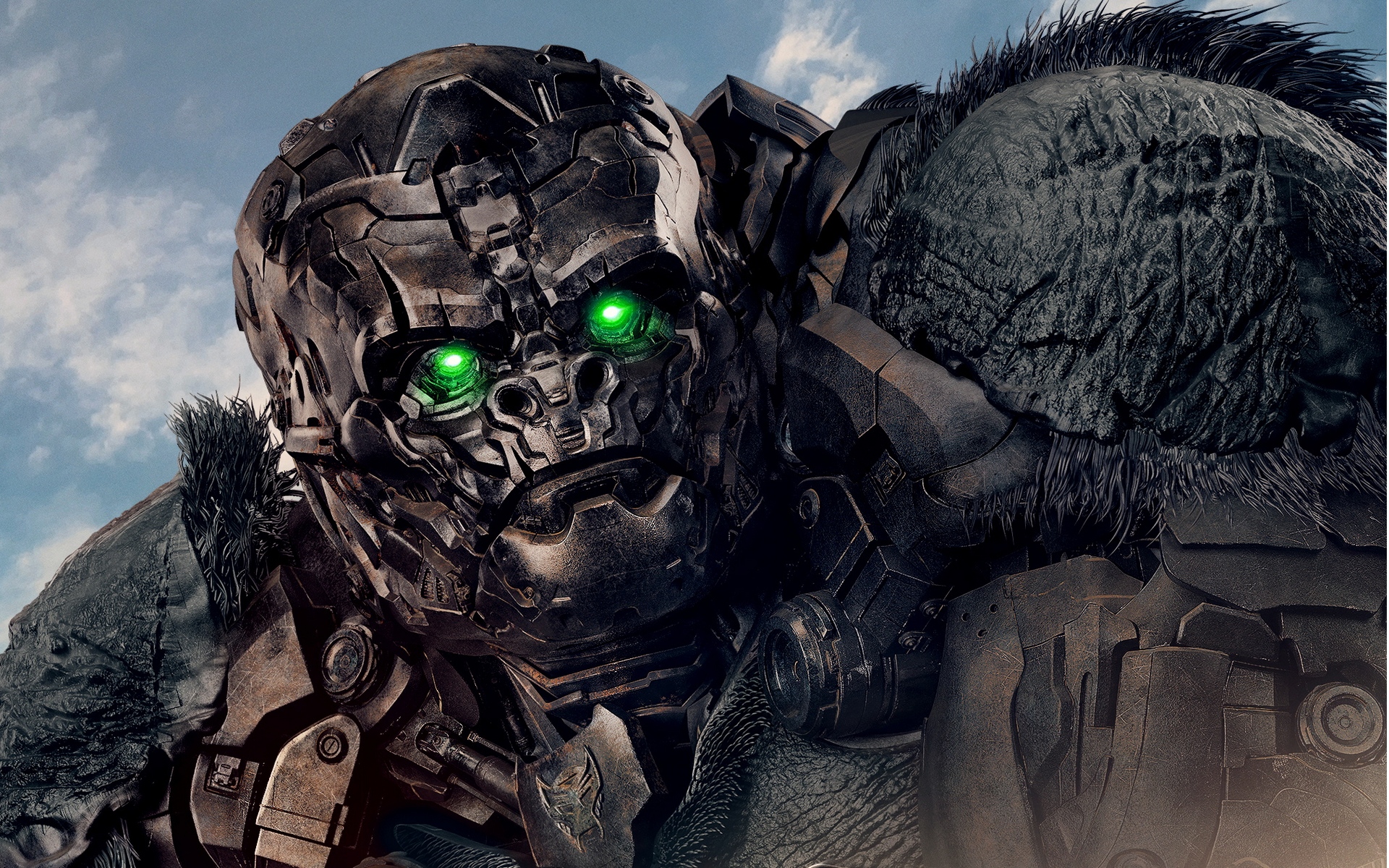 Description: A robot with green eyes and a furry coat on his face and shoulders.