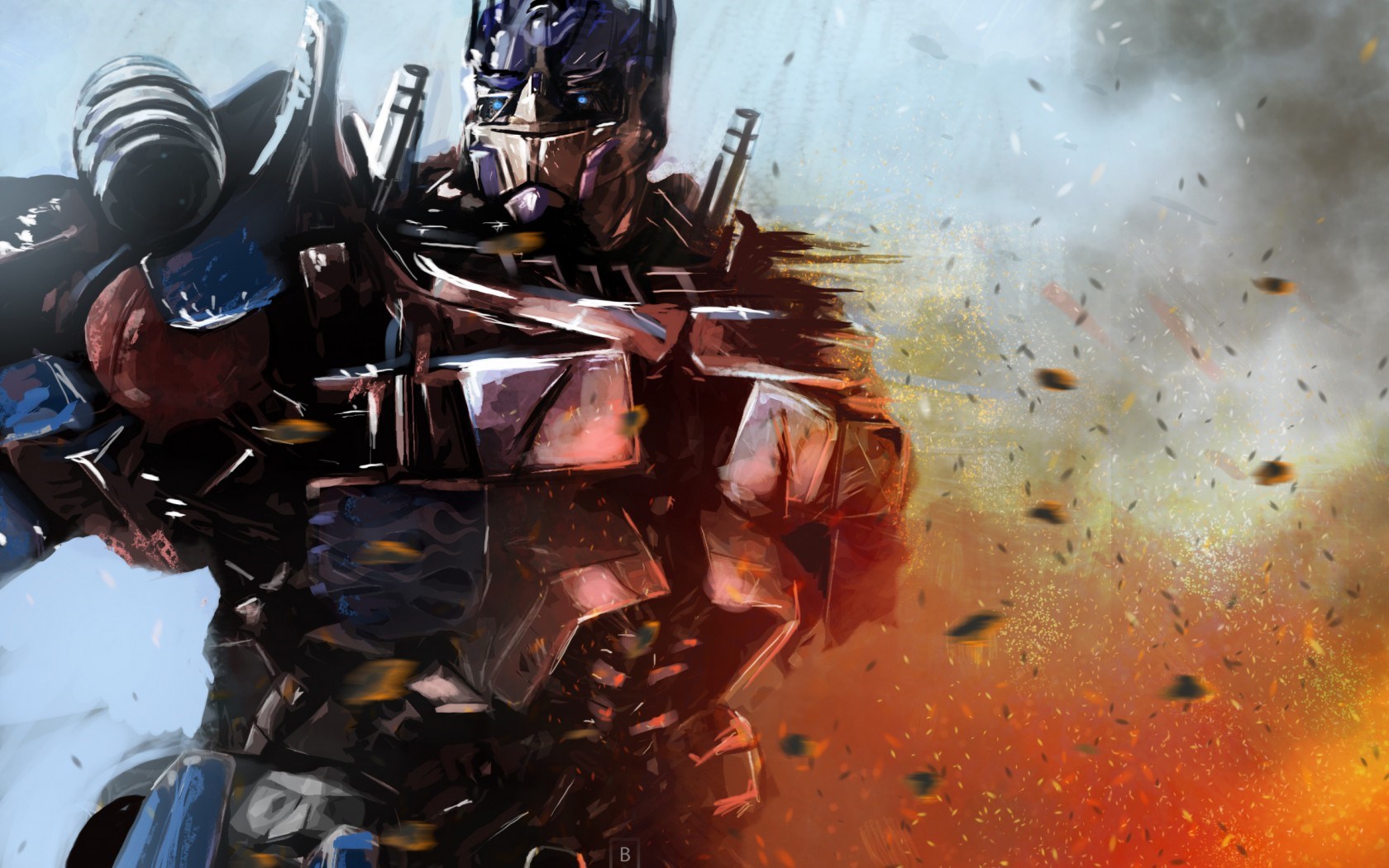 Description: A robot with a gun in his hand and a fire behind him in the background.