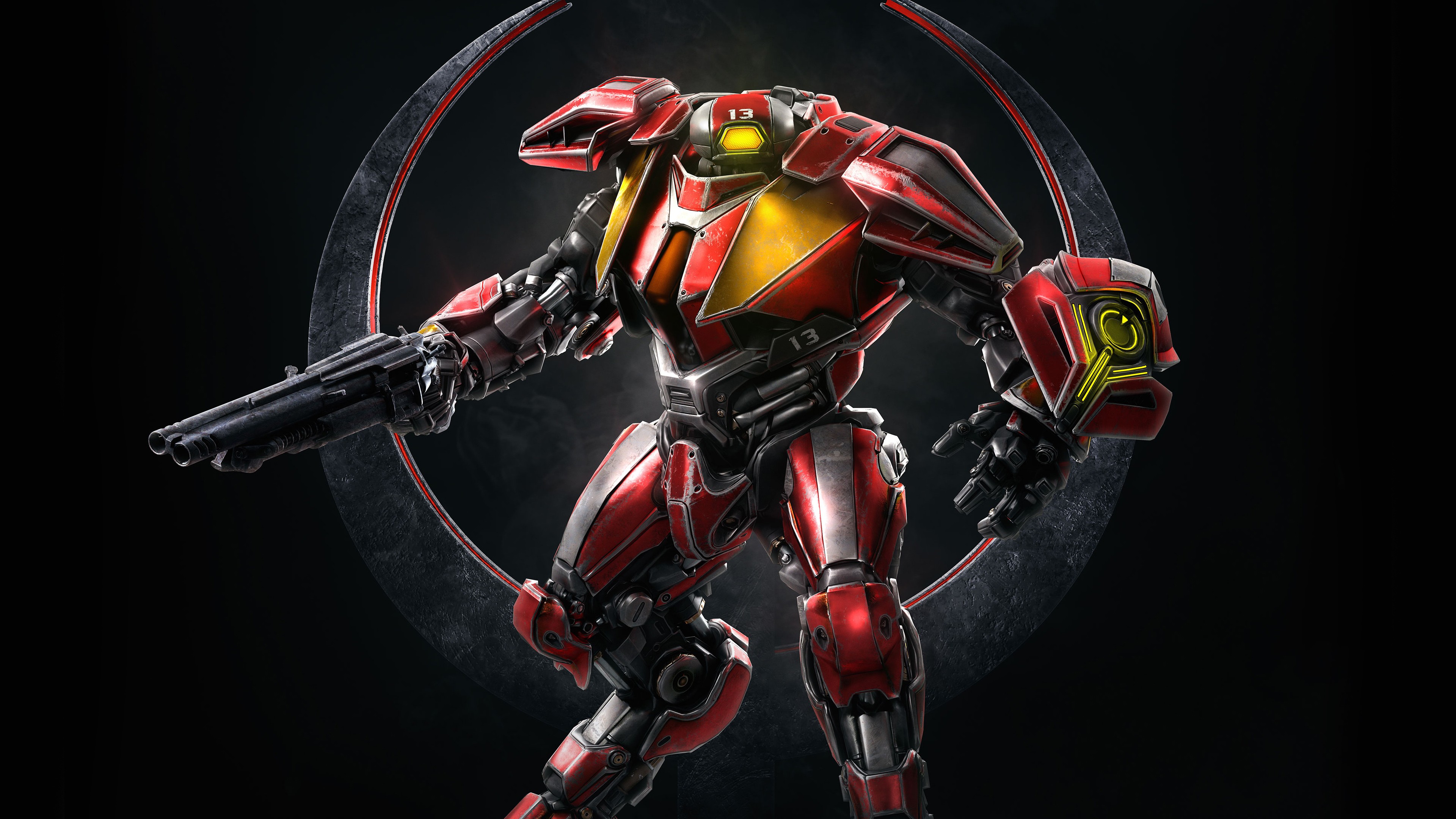 Description: A robot with a gun in its hand and a circle around it with a black background and a red and yellow color scheme.