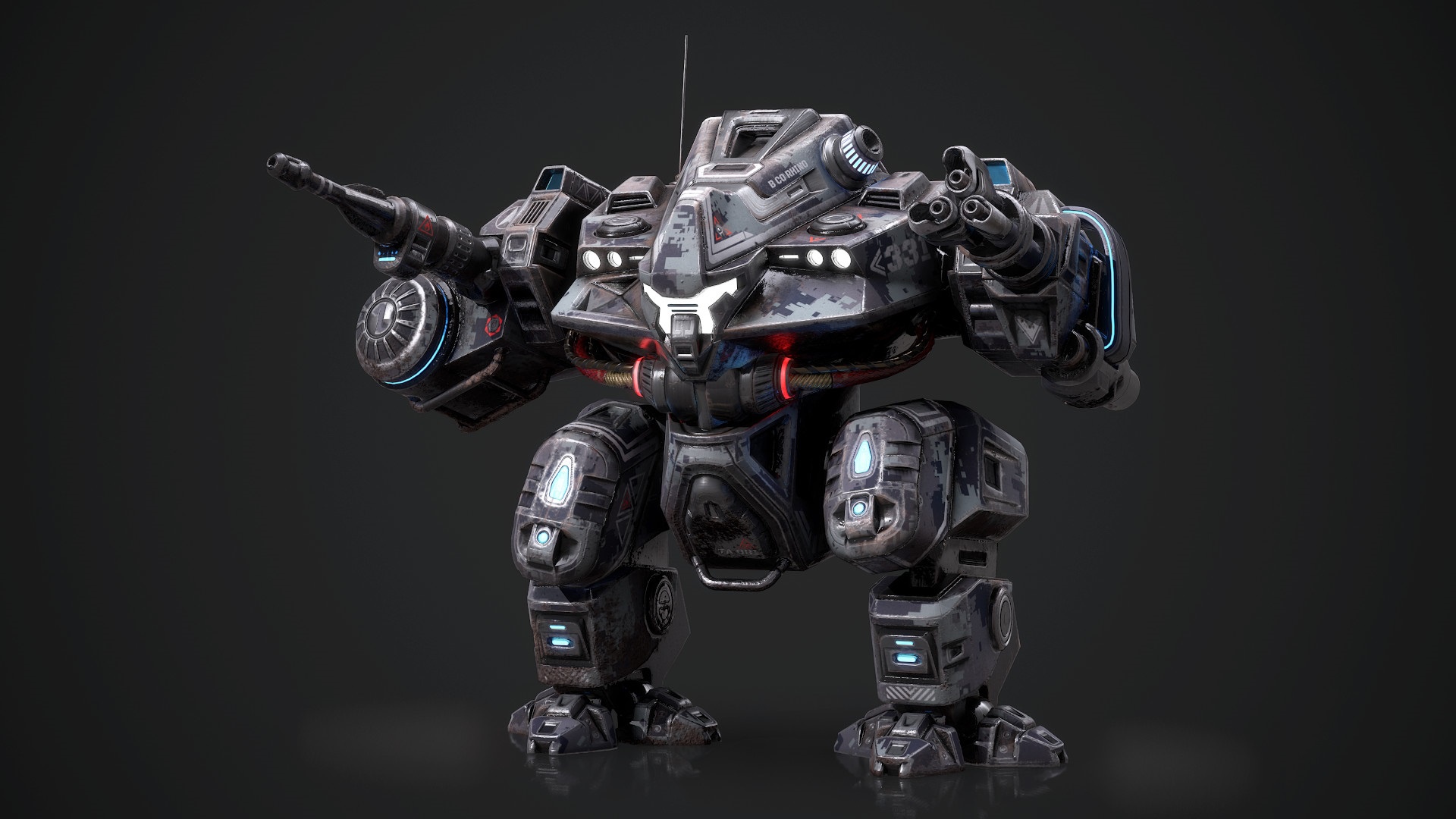 Description: A robot with a gun in its hand and a black background with a black background and a black background.