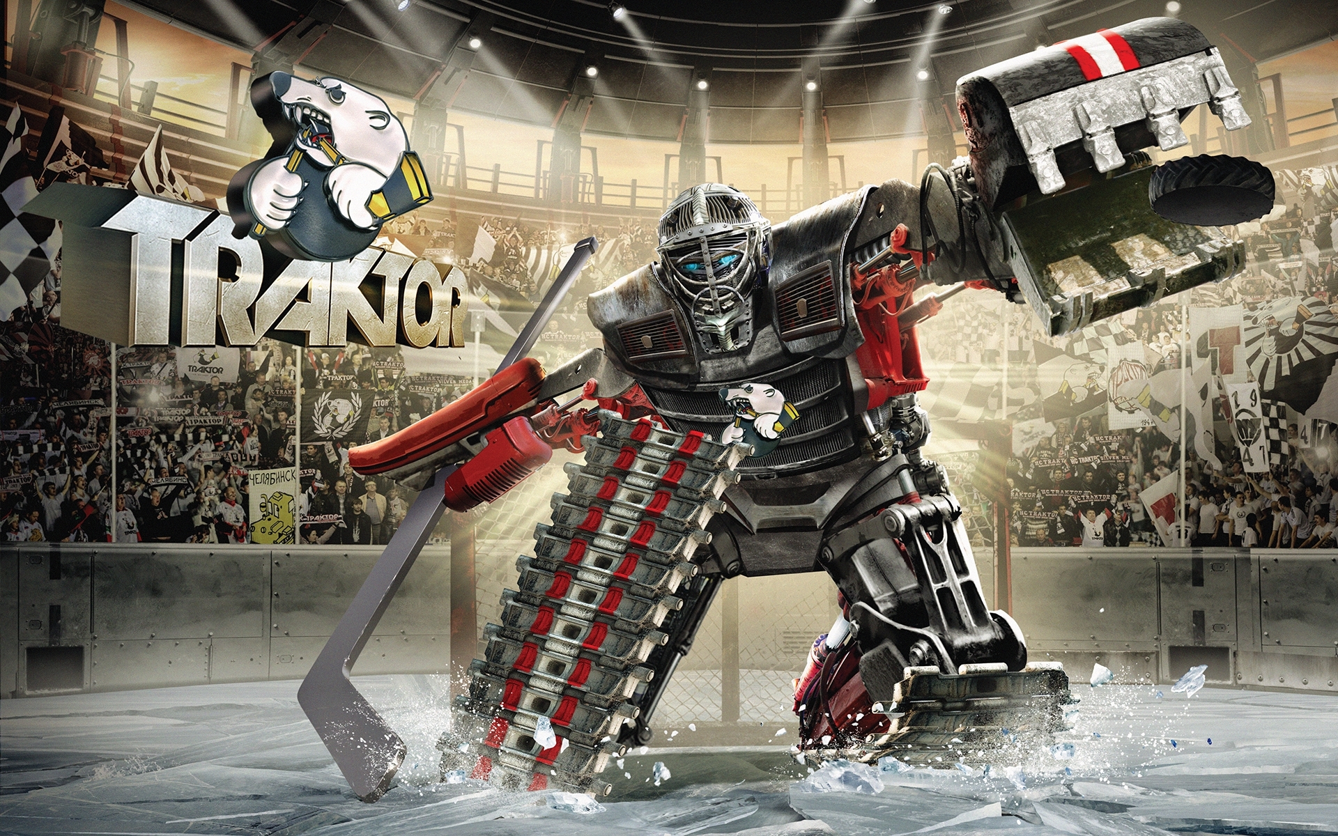 Description: A robot hockey player is in the water with a hockey stick in his hand and a hockey stick in his other hand.