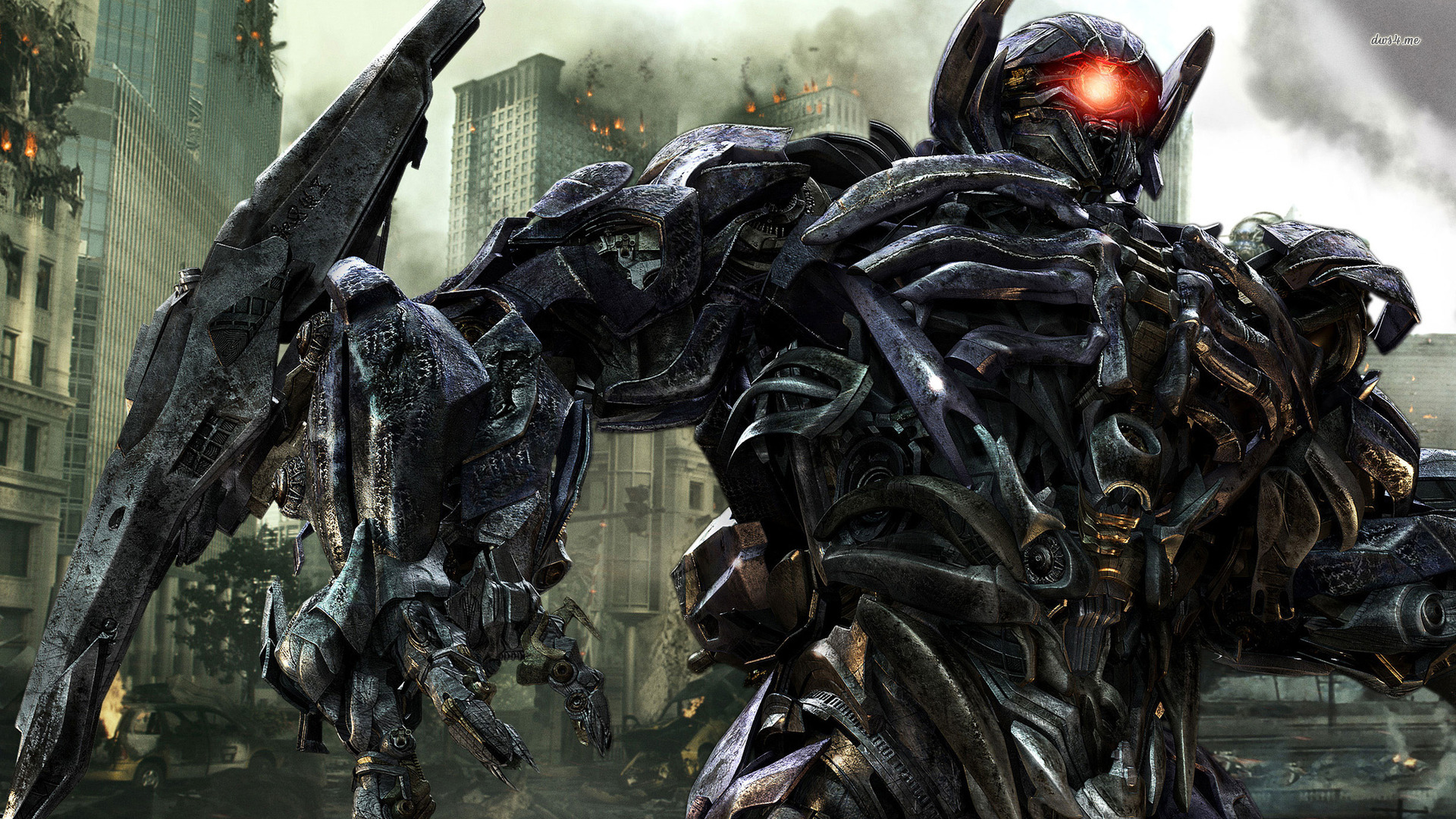 Description: A robot with a huge arm and a red eye in a city setting with buildings and skyscrapers in the background.