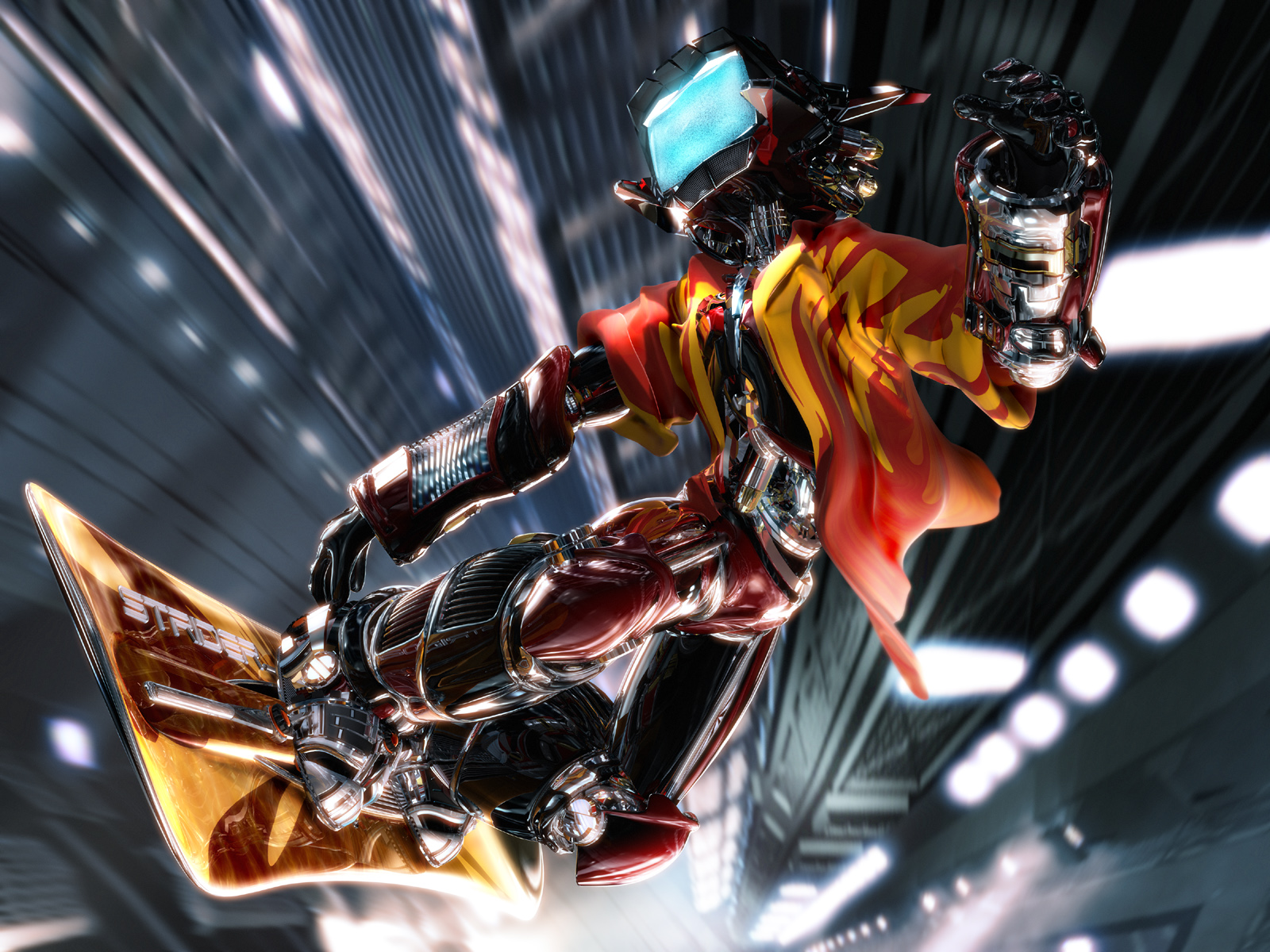 Description: A robot riding a motorcycle in a futuristic city with lights and smoke behind it.