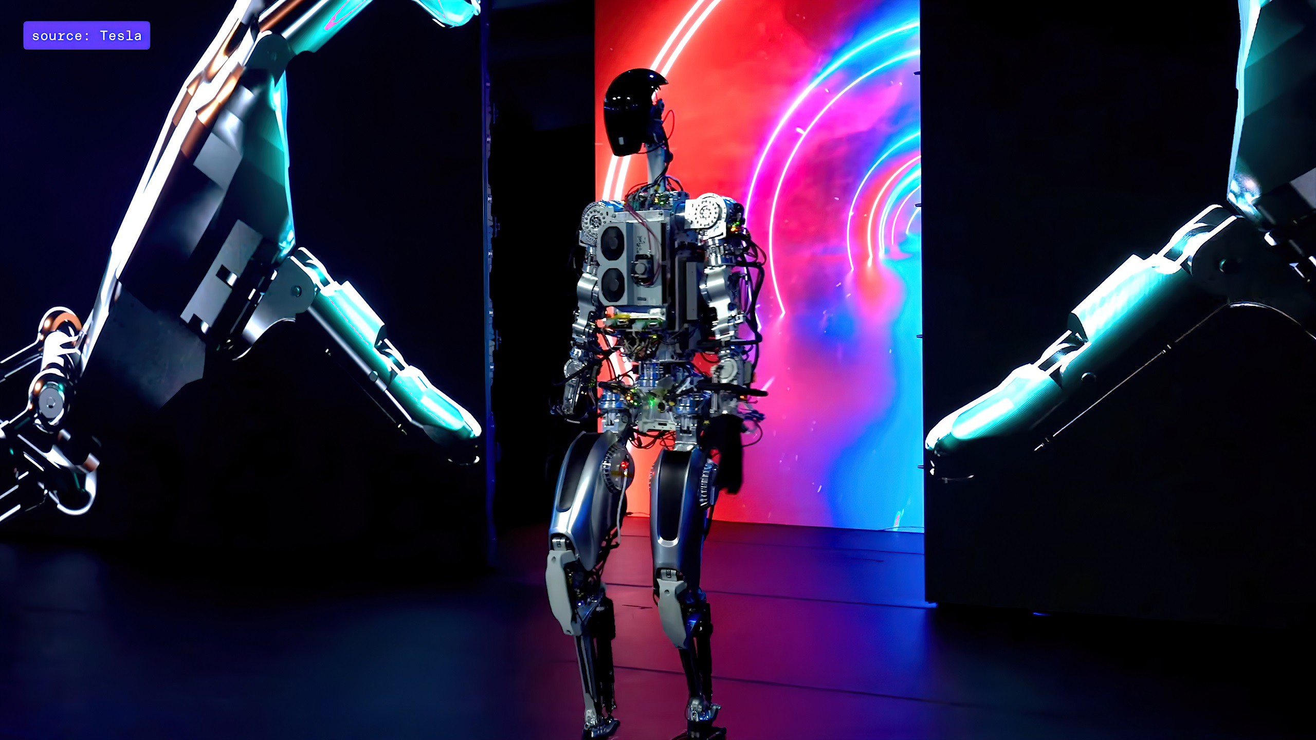 Description: A robot standing in front of a colorful background with a neon light behind it and a neon light behind it.