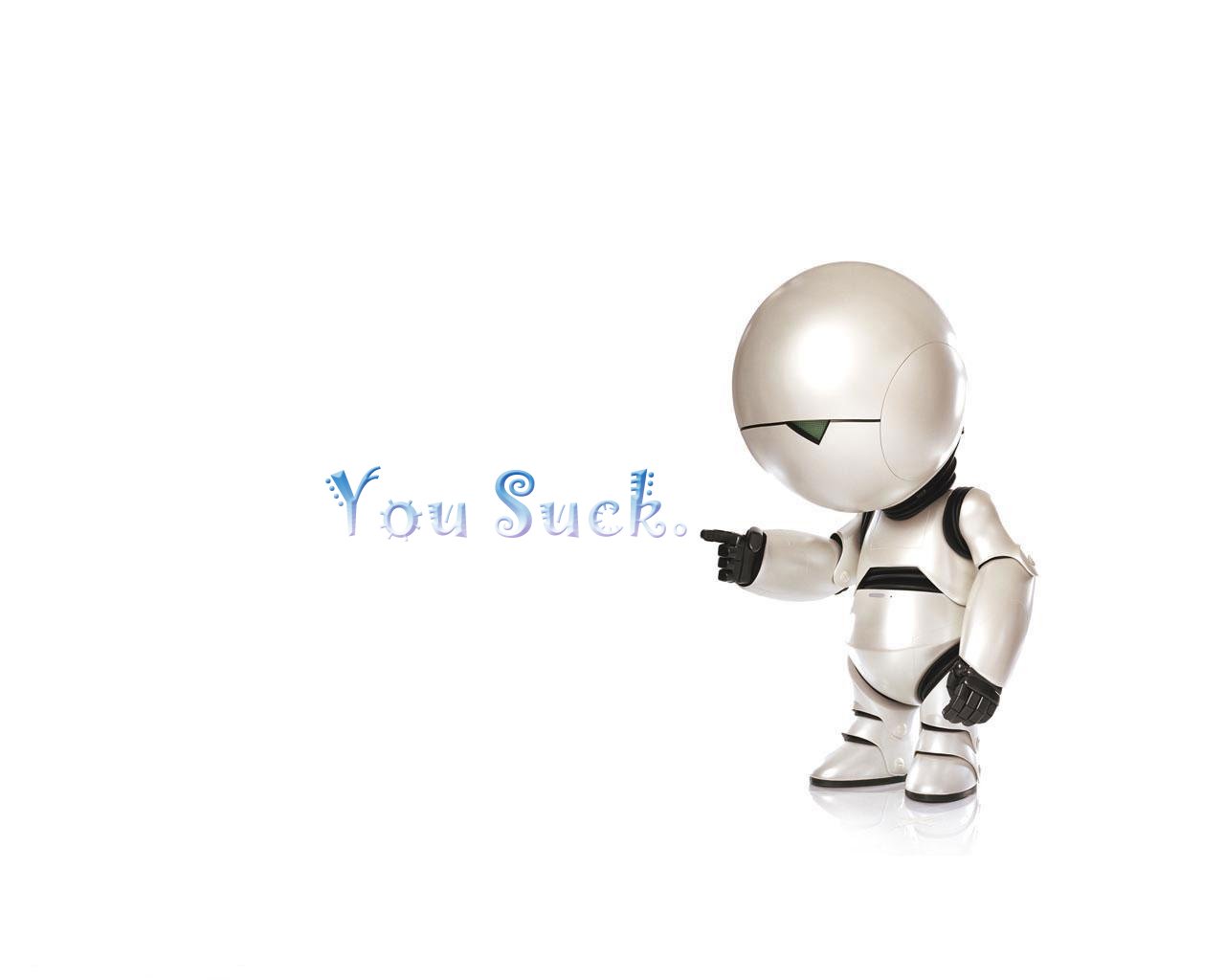 Description: A robot pointing at the word you suck on a white background with a blue background and a white background.