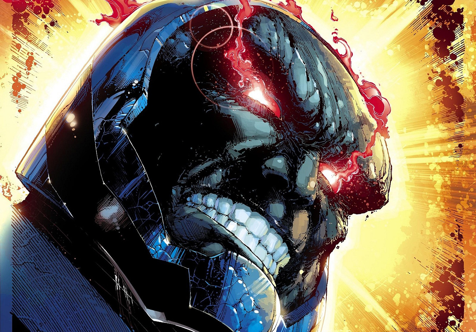 Description: A close up of a robot with a red light coming out of his face and a yellow background with a red light coming out of his mouth.