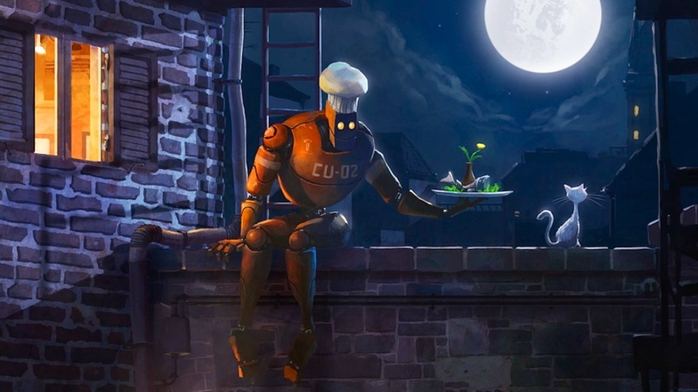 Description: A robot is sitting on a ledge with a plate of food in his hand and a cat is standing on the ledge.
