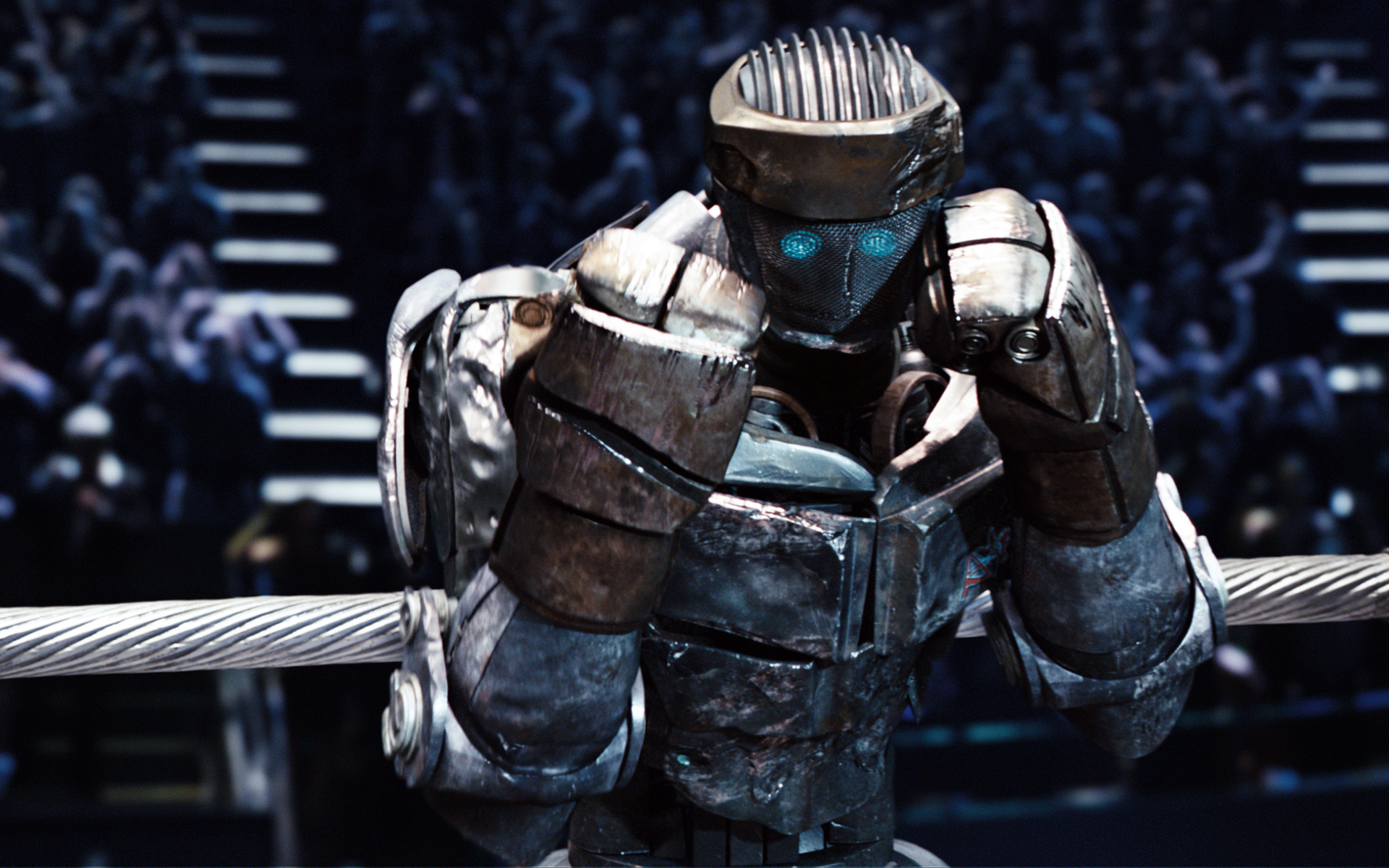 Description: A robot is sitting on a rope in front of a crowd of people in a stadium with a microphone.