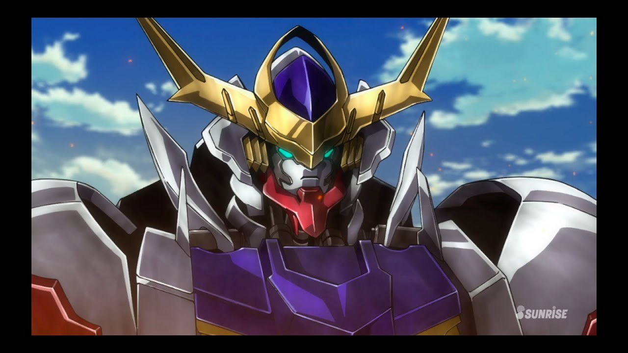 Description: A robot that is standing in the sky with a sword in his hand and a helmet on his head.