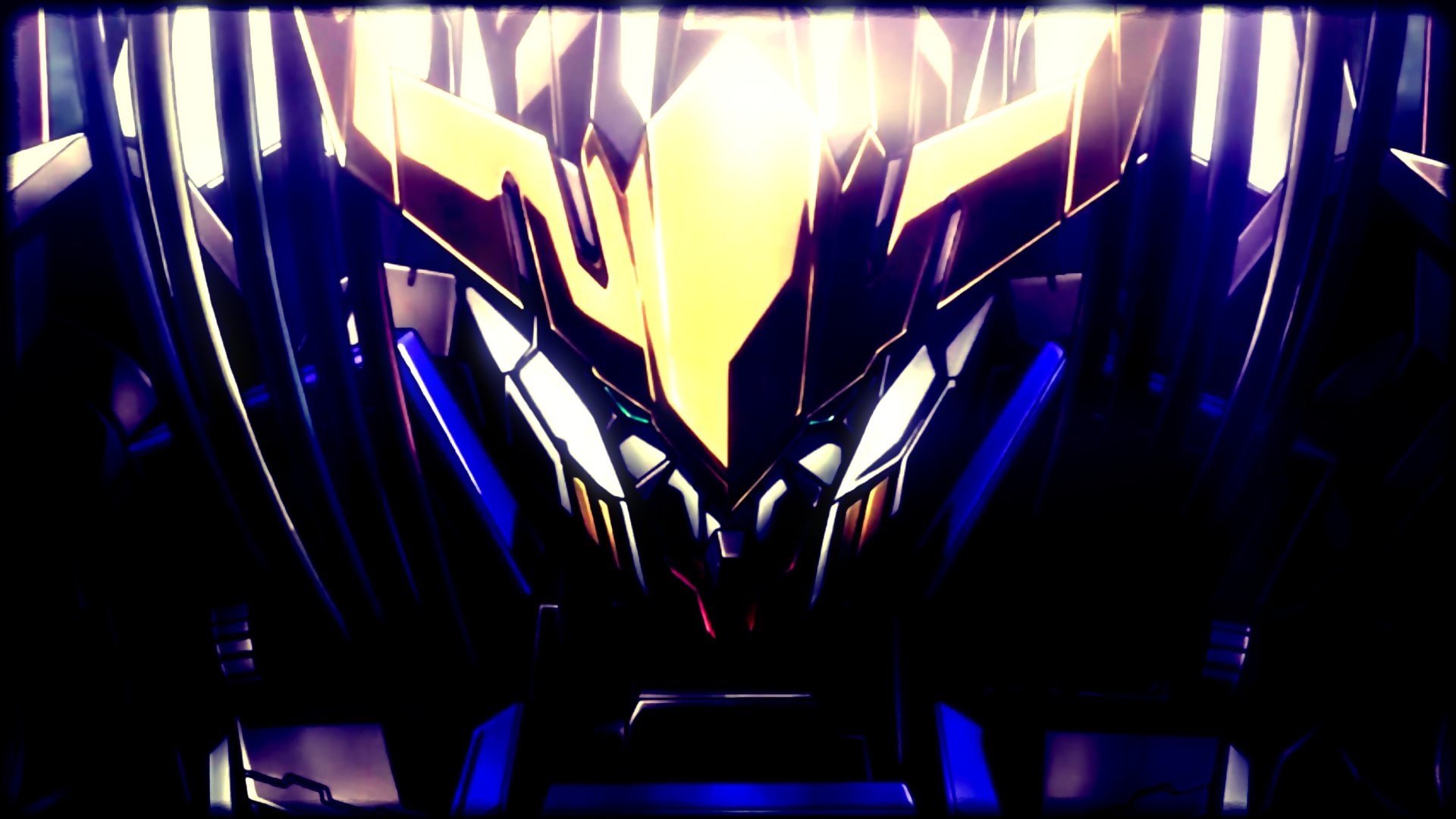 Description: A stylized image of a robot suit with a yellow and blue face and tail lights on it's head.