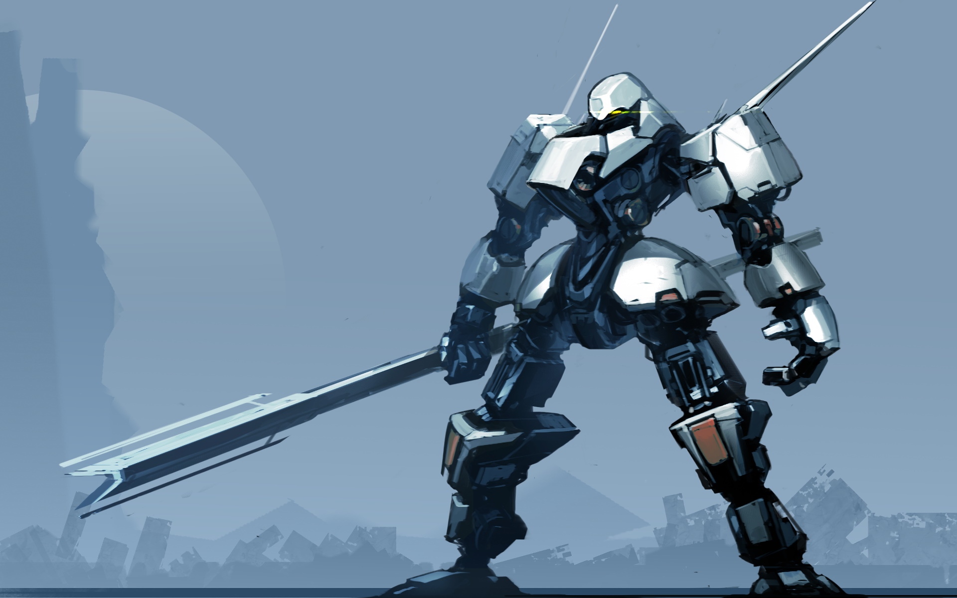 Description: A robot with a sword standing in front of a mountain range with a city in the background and a blue sky.