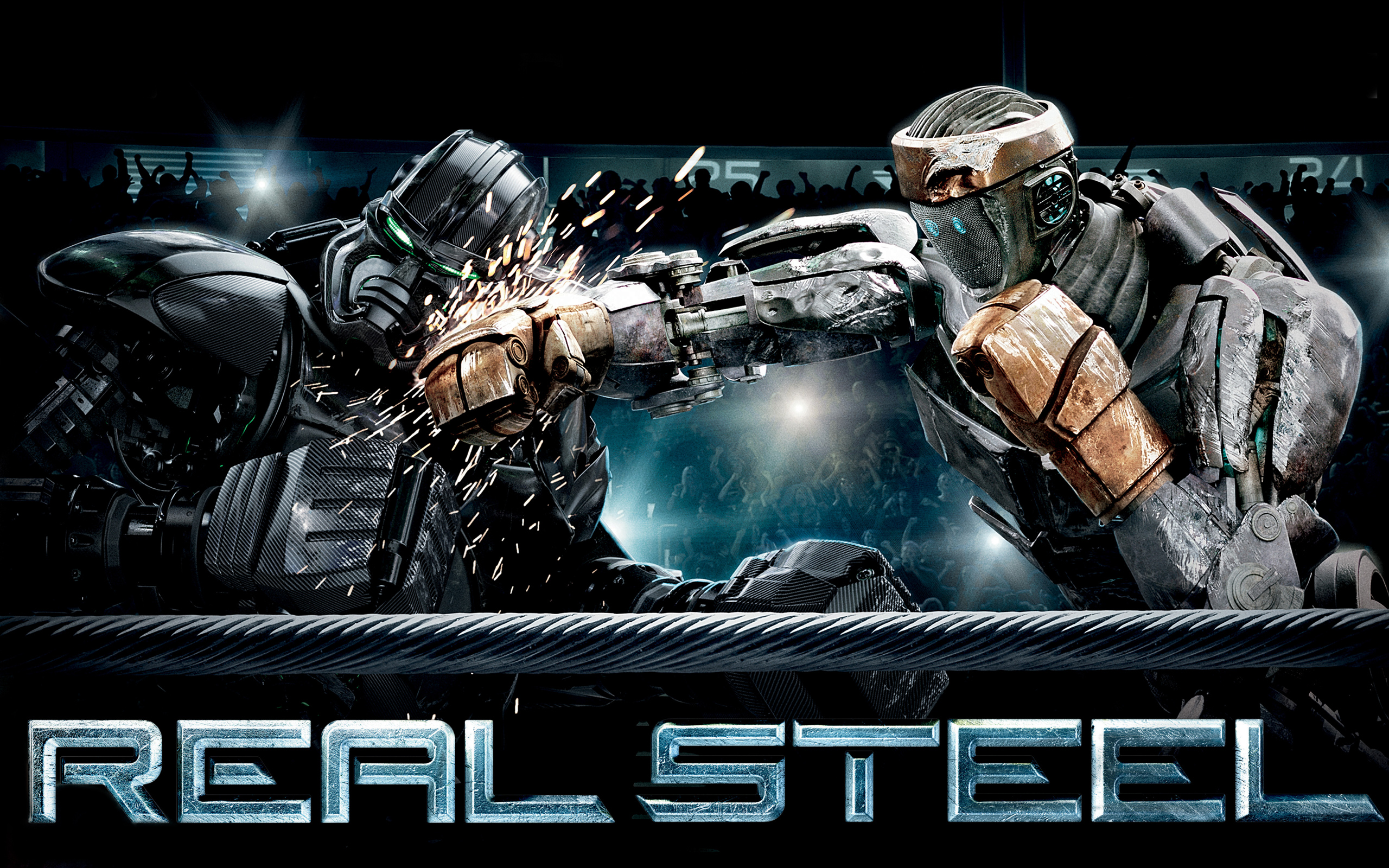 Description: A couple of robots fighting each other in a game screen shot with the words real steel in the middle.