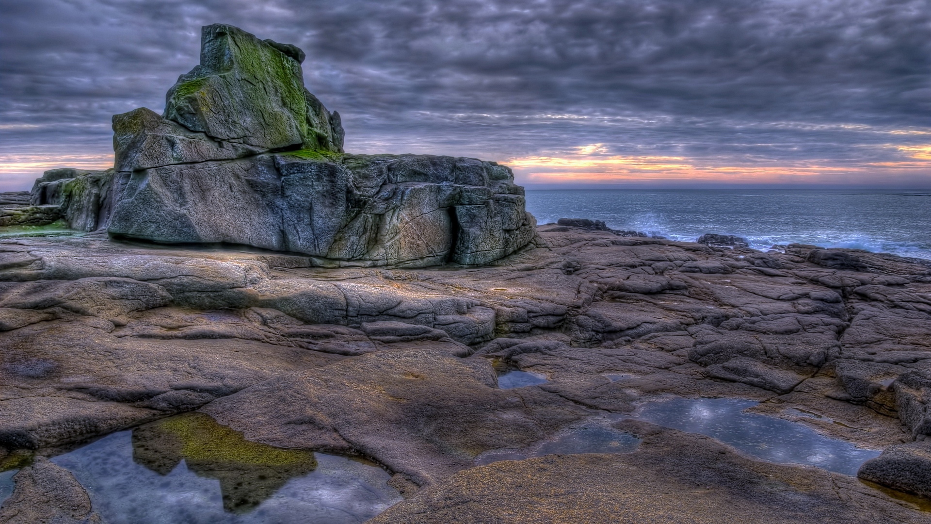 Description: A rock formation on a rocky beach with a sunset in the background and a body of water in the foreground.