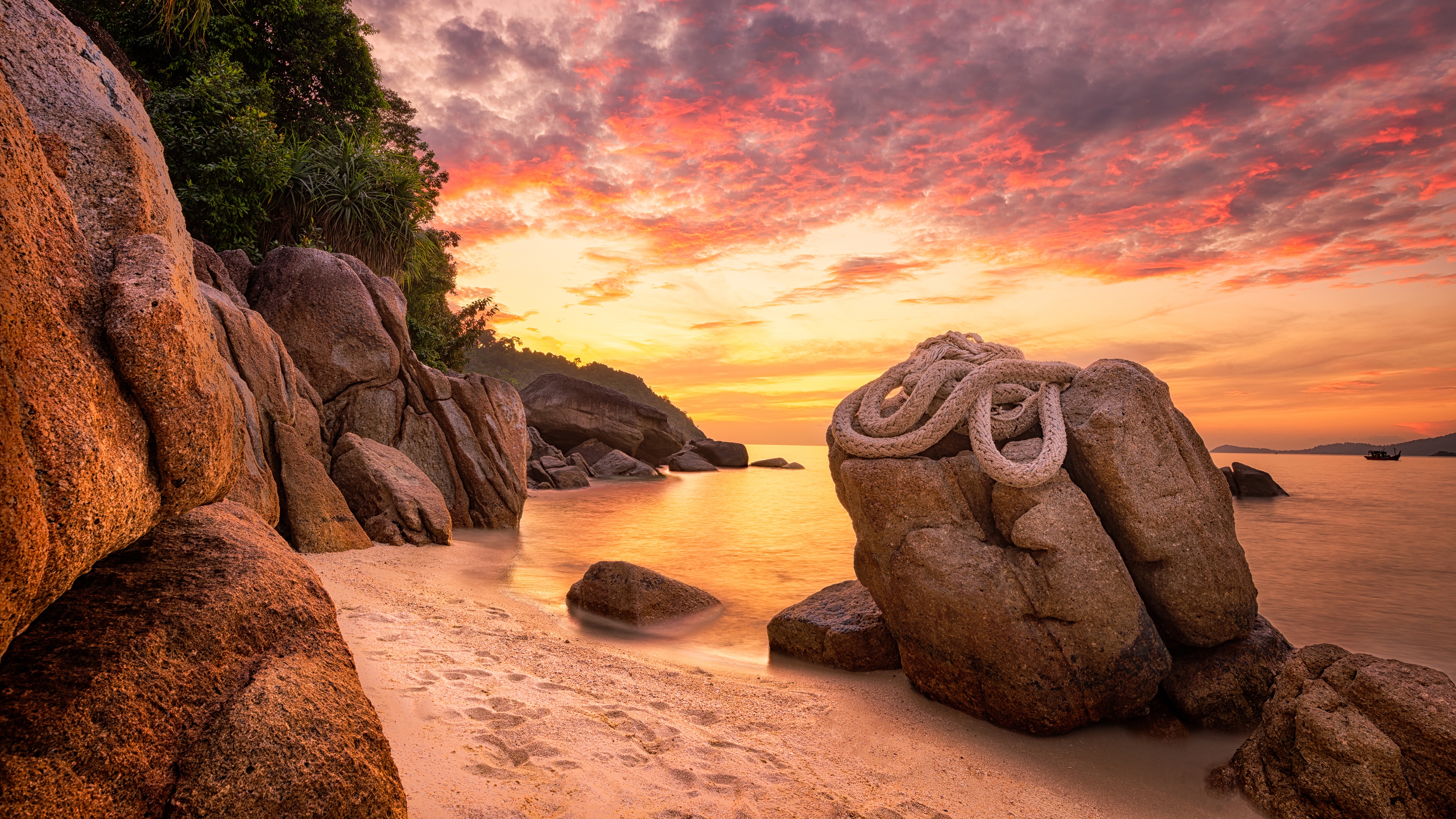Description: A rock formation on a beach with a snake carved into it at sunset or dawn with a pink sky.