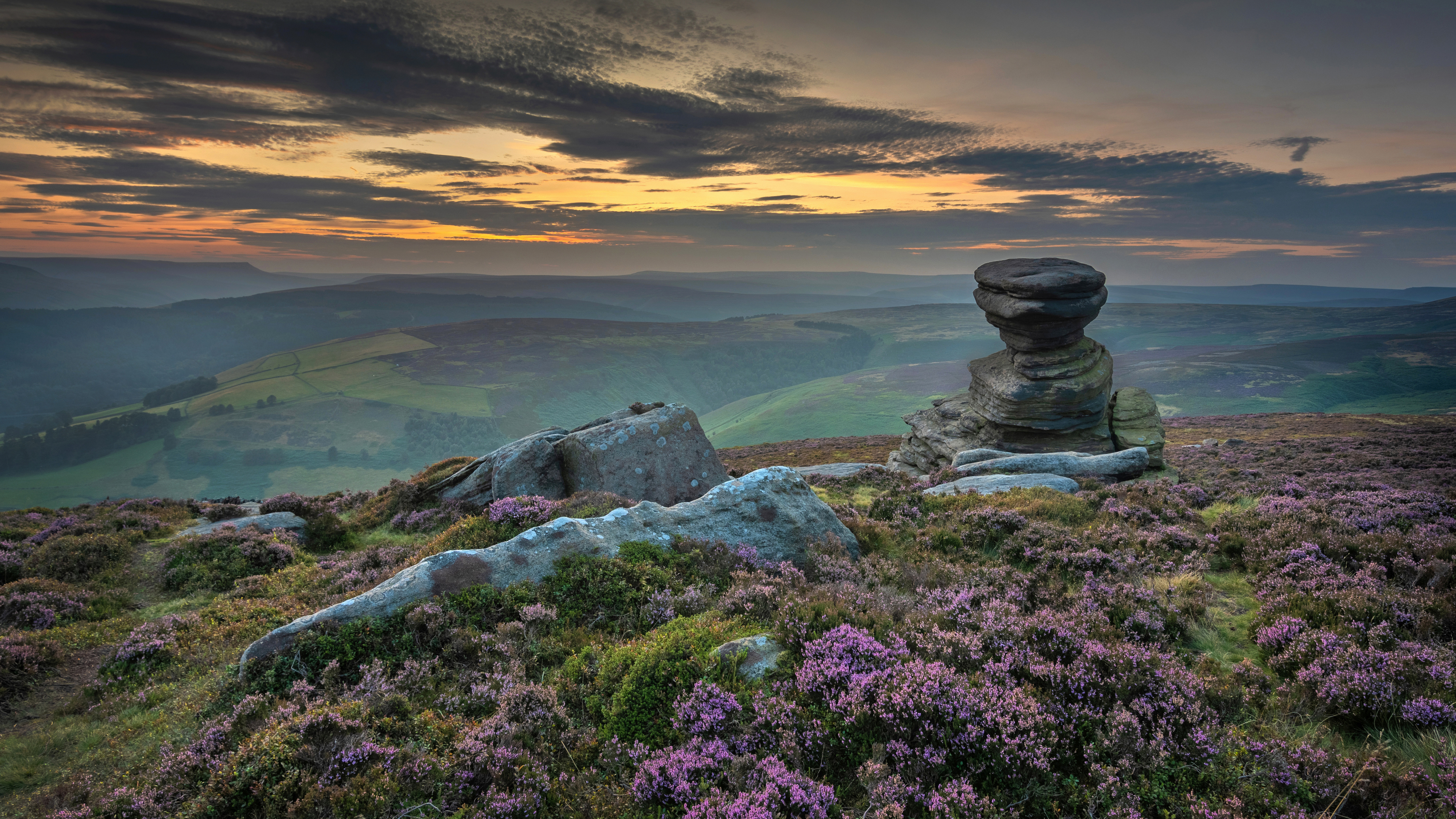 Description: A rock formation on a grassy hill with purple flowers in the foreground and a sunset in the background.