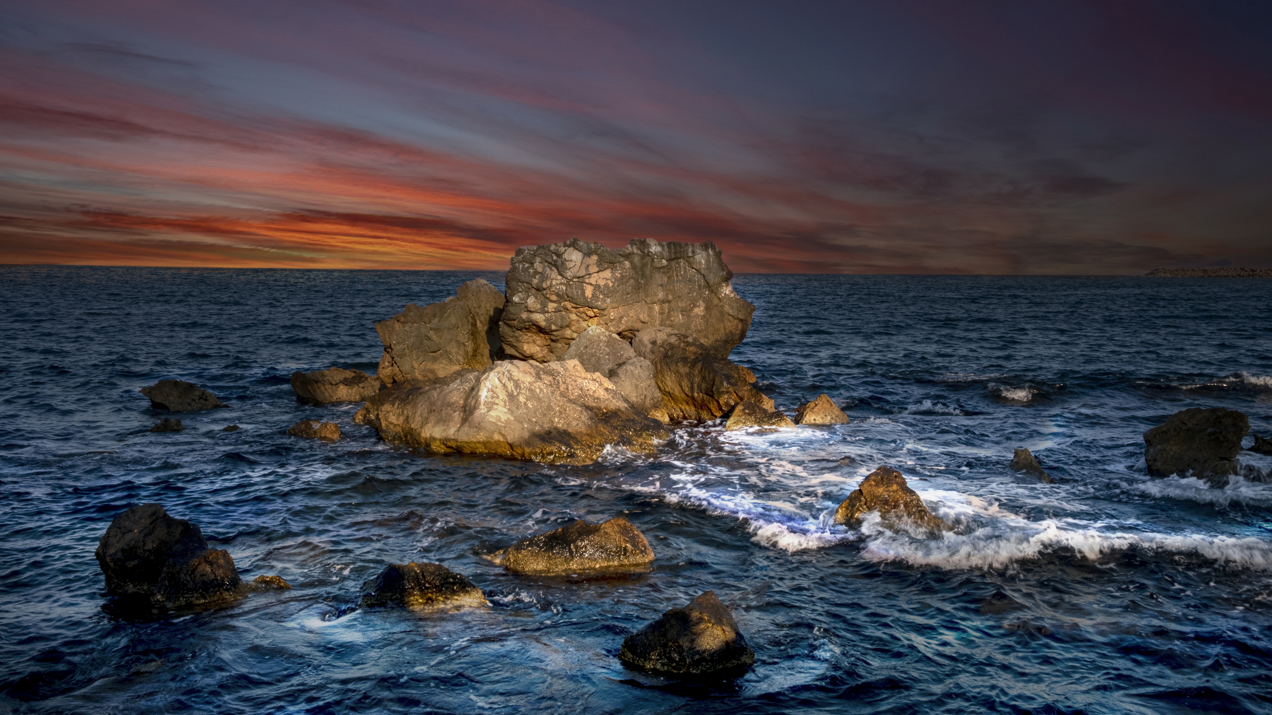 Description: A rock formation in the middle of the ocean with a sunset in the background and a red sky above.