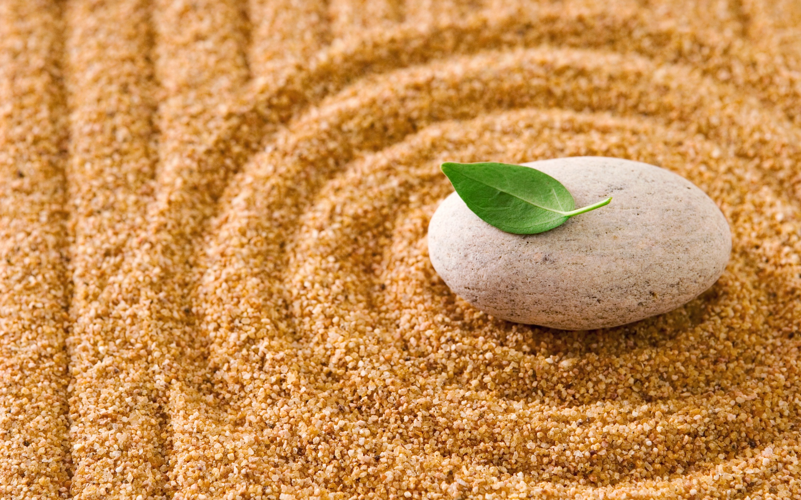 Description: A rock with a green leaf on top of it in a sand garden area with a spiral design in the background.