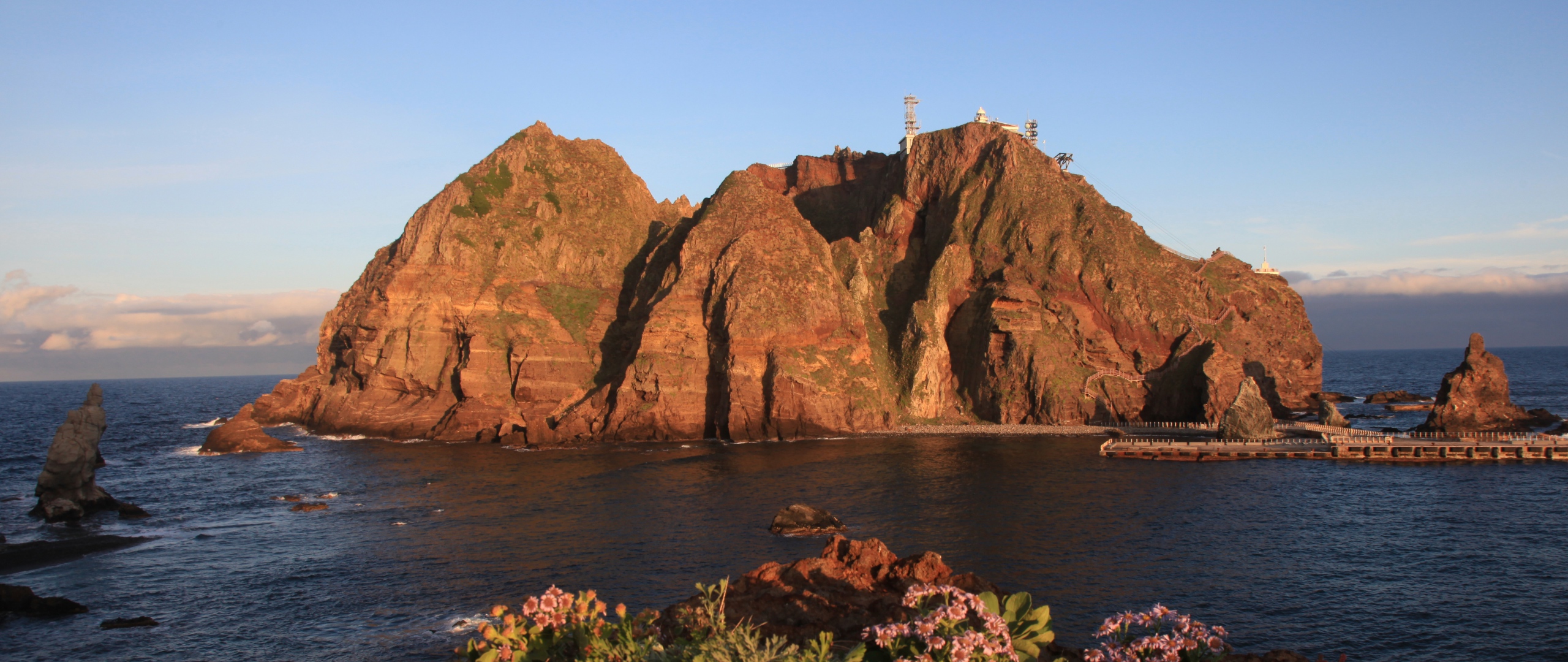 Description: A large rock formation in the middle of the ocean with a lighthouse on top of it and a pier in the middle of the water.