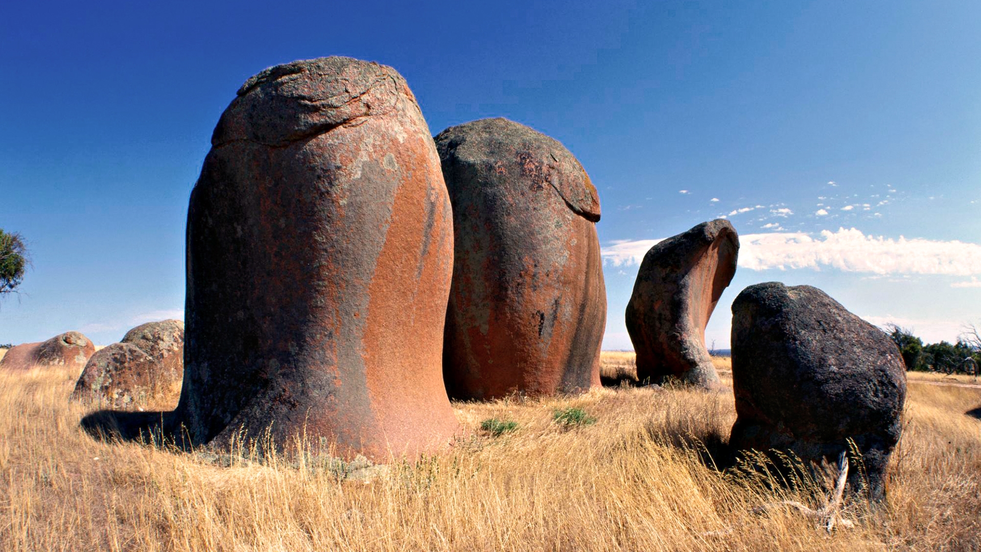Description: A group of large rocks sitting in a field of grass and tall grass with a blue sky in the background.