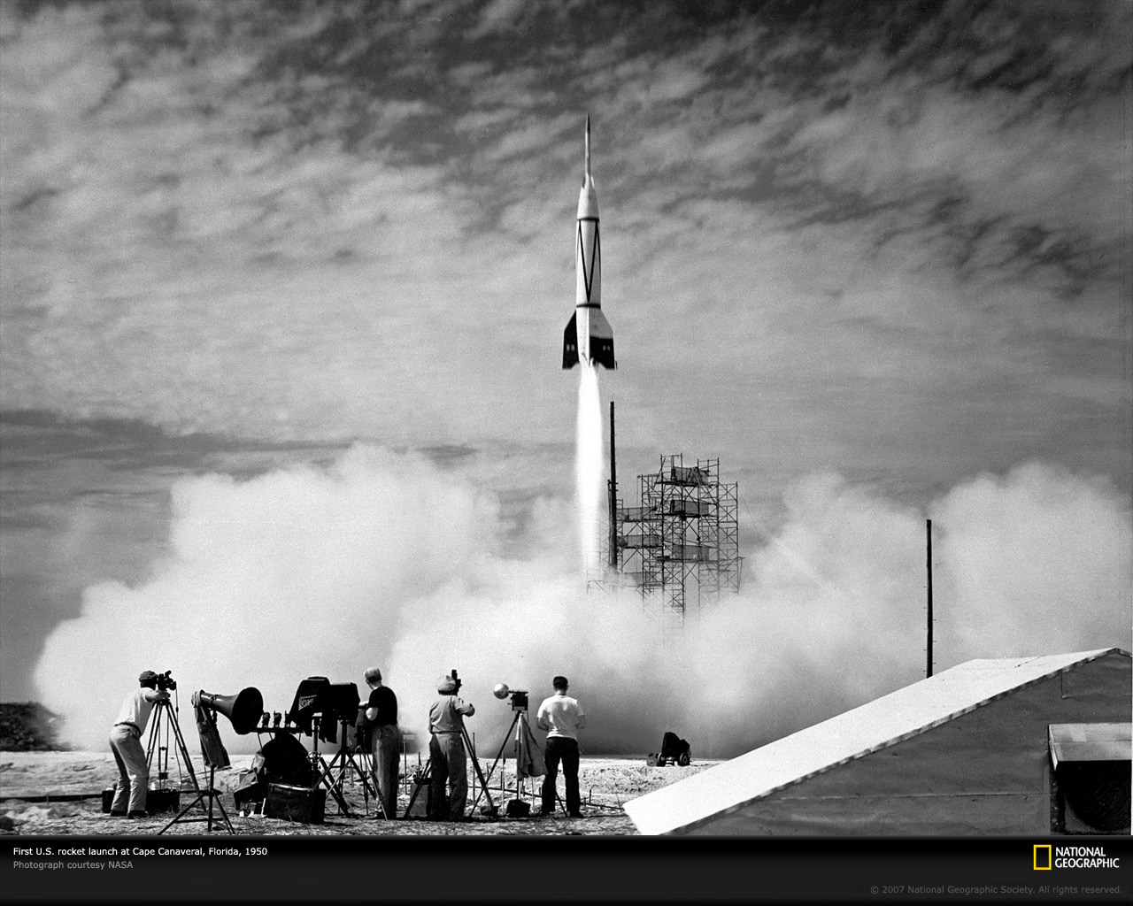 Description: A group of people standing around a rocket on a cloudy day with smoke coming out of it and a man standing on a ladder.