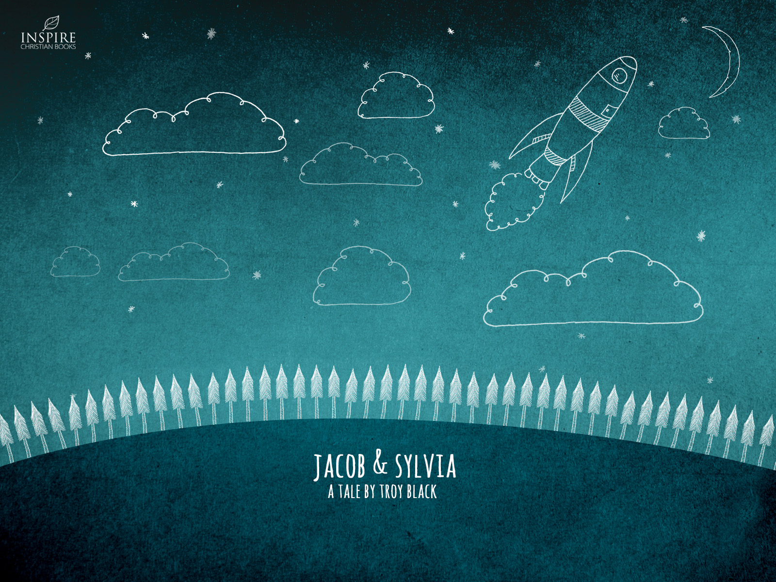 Description: A drawing of a rocket flying through the sky with clouds and stars above it.