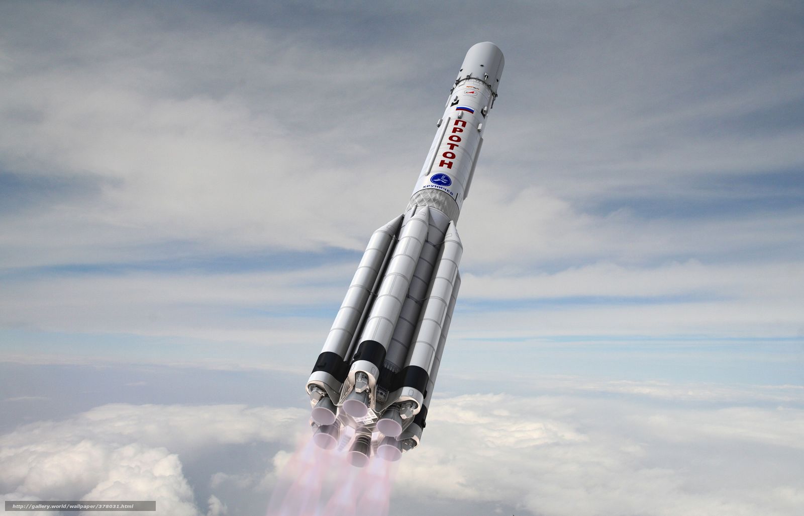 Description: A rocket is flying through the air with smoke coming out of it's back end and a blue sky with clouds.