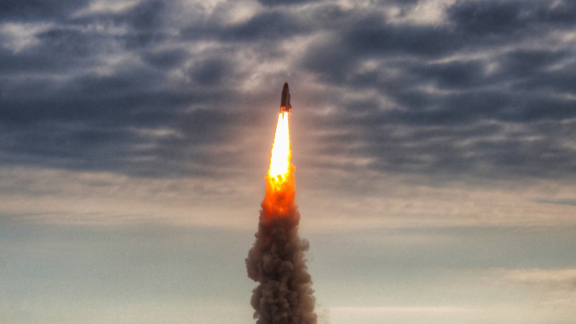 Description: A rocket is launching into the sky with smoke coming out of it's back end and a cloud filled sky behind it.