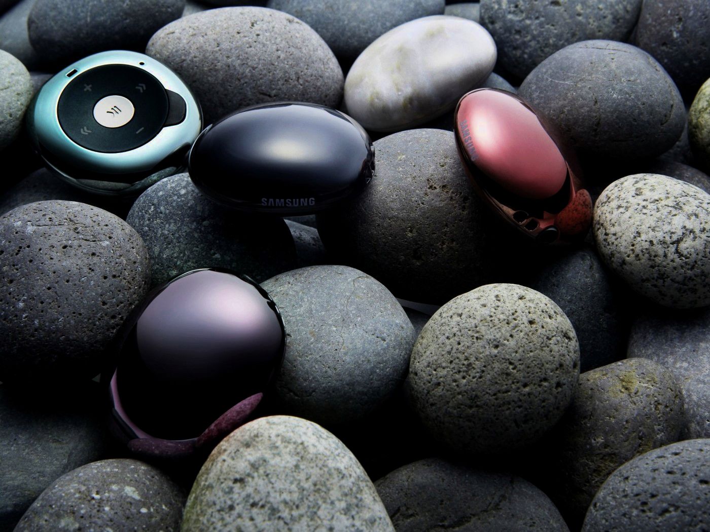 Description: A group of rocks with a pair of headphones on top of them and a pair of ear buds.