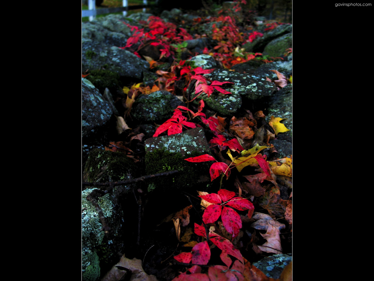Description: A row of rocks with red leaves on them and a bench in the background with a light on it.