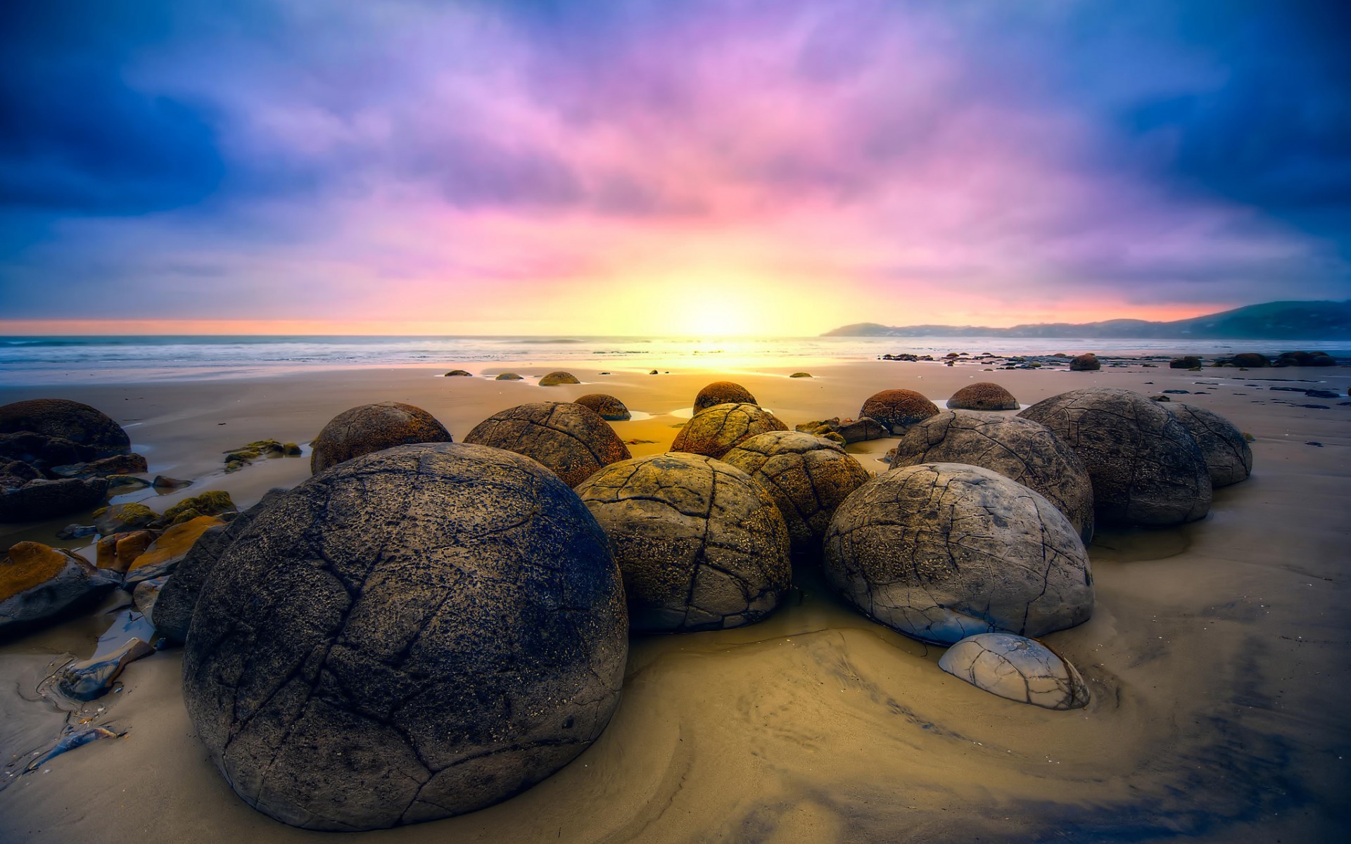 Description: A group of rocks sitting on top of a sandy beach under a cloudy sky at sunset with the sun setting.