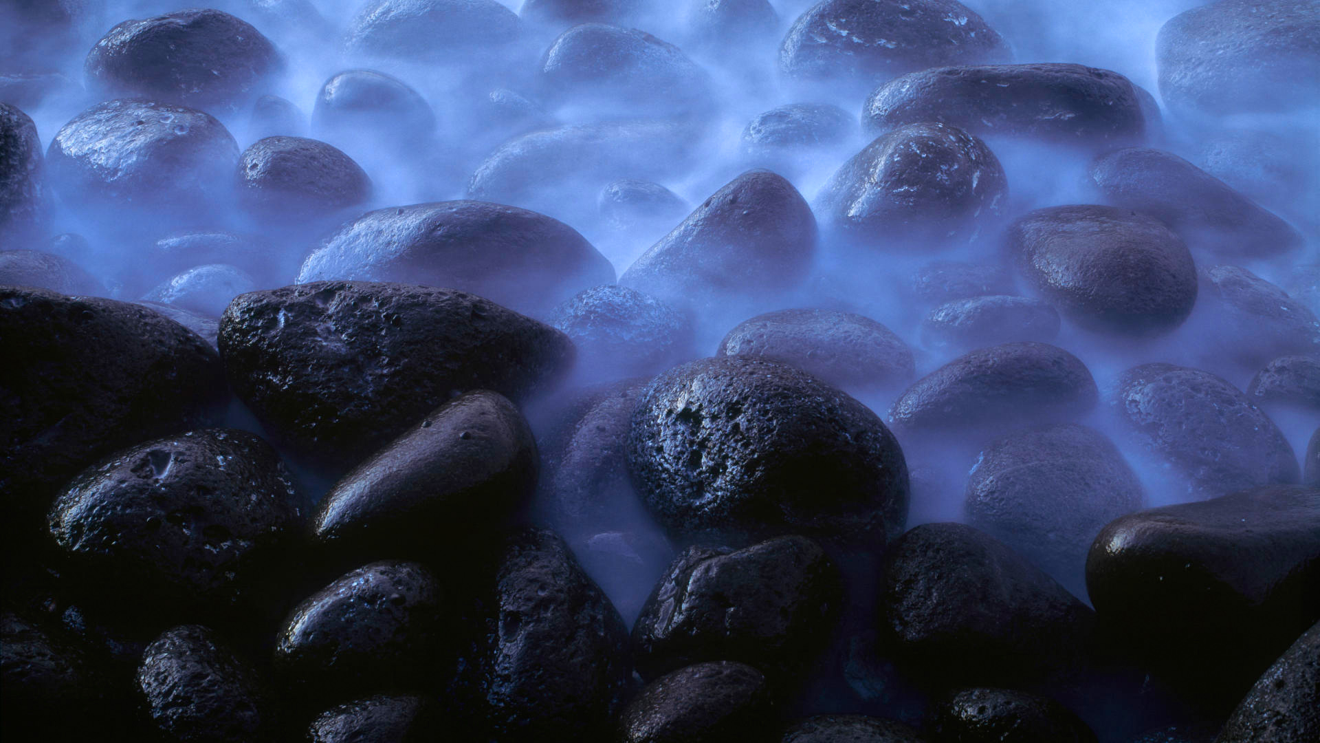 Description: A bunch of rocks that are in the water with some water bubbles on them and some rocks on the ground.