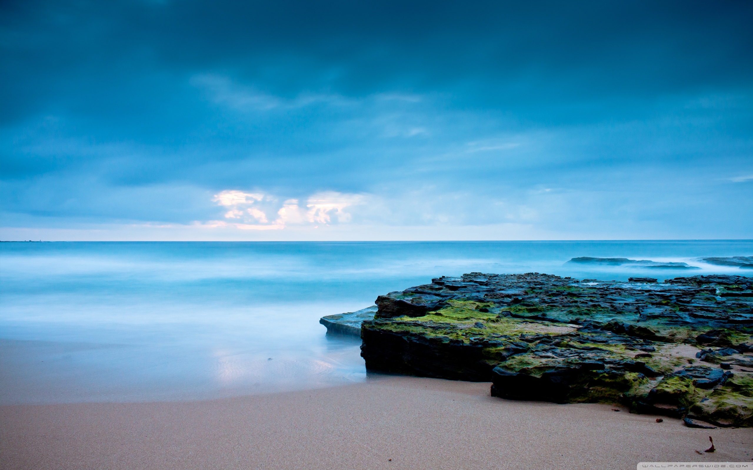 Description: A rocky beach with a body of water in the distance and a cloudy sky above it.