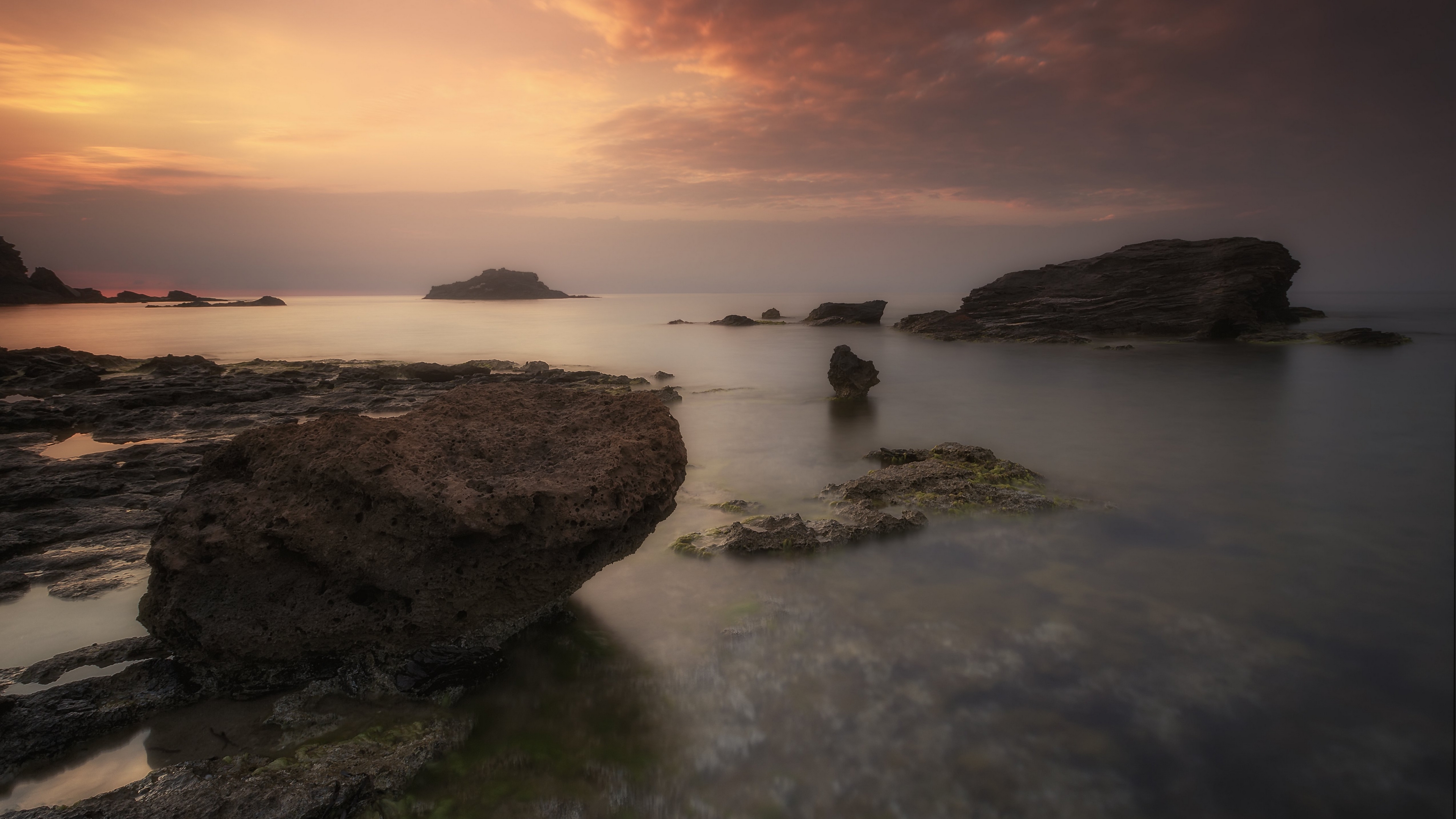 Description: A rocky beach with a large rock in the middle of it and a cloudy sky above it.