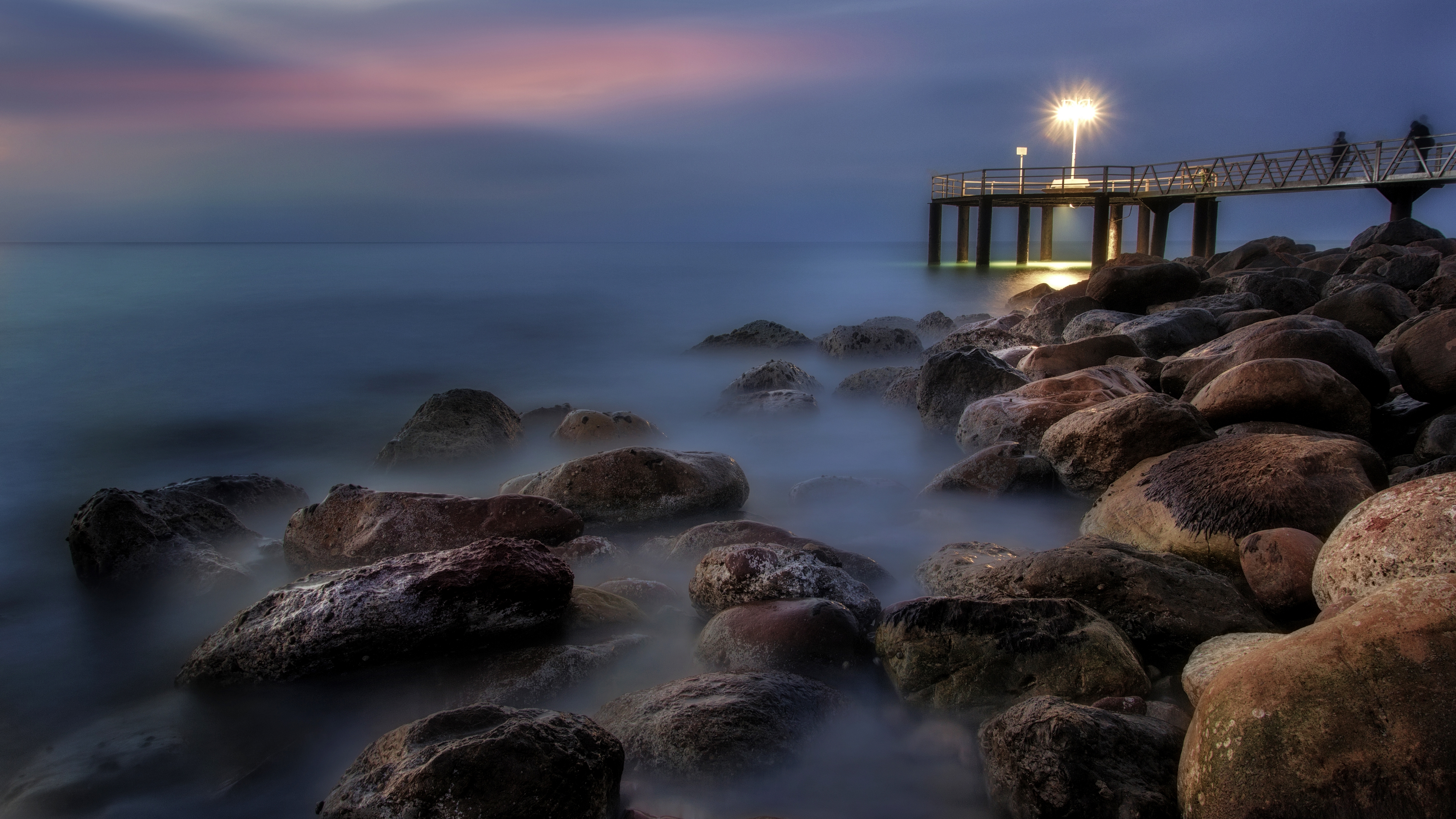 Description: A pier at the end of a rocky beach at night with lights on it and a person standing on the pier.