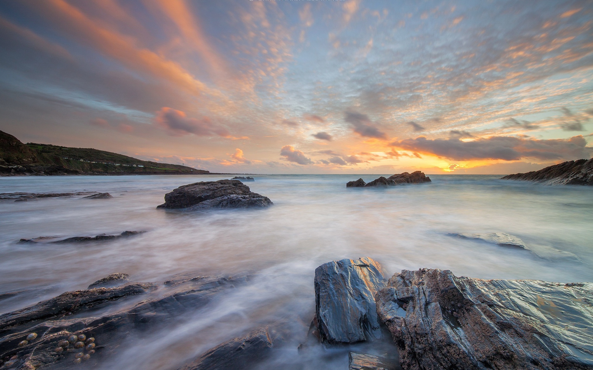 Description: A rocky beach with a sunset in the background and clouds in the sky above it and a body of water with rocks in the foreground.