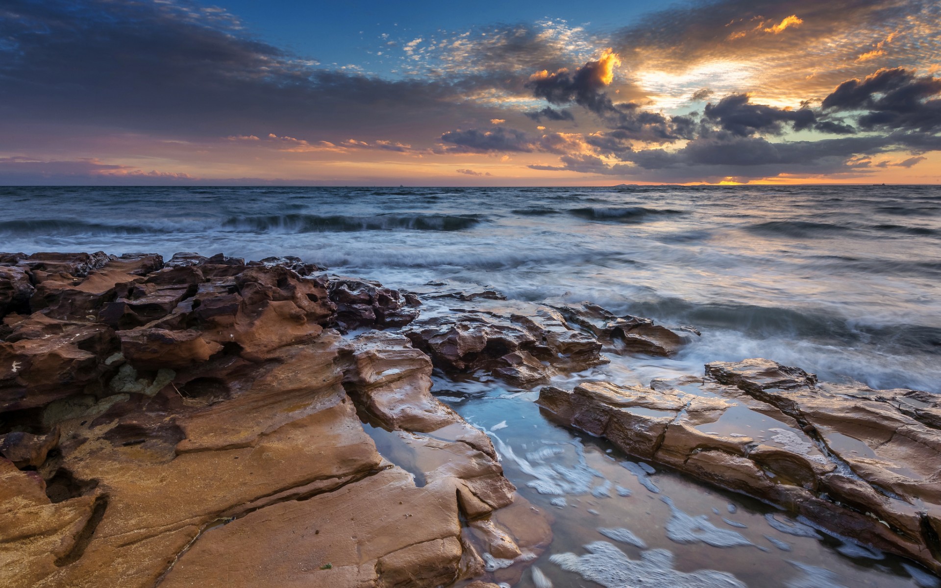 Description: A rocky beach with a sunset in the background and clouds in the sky above it and water below it.