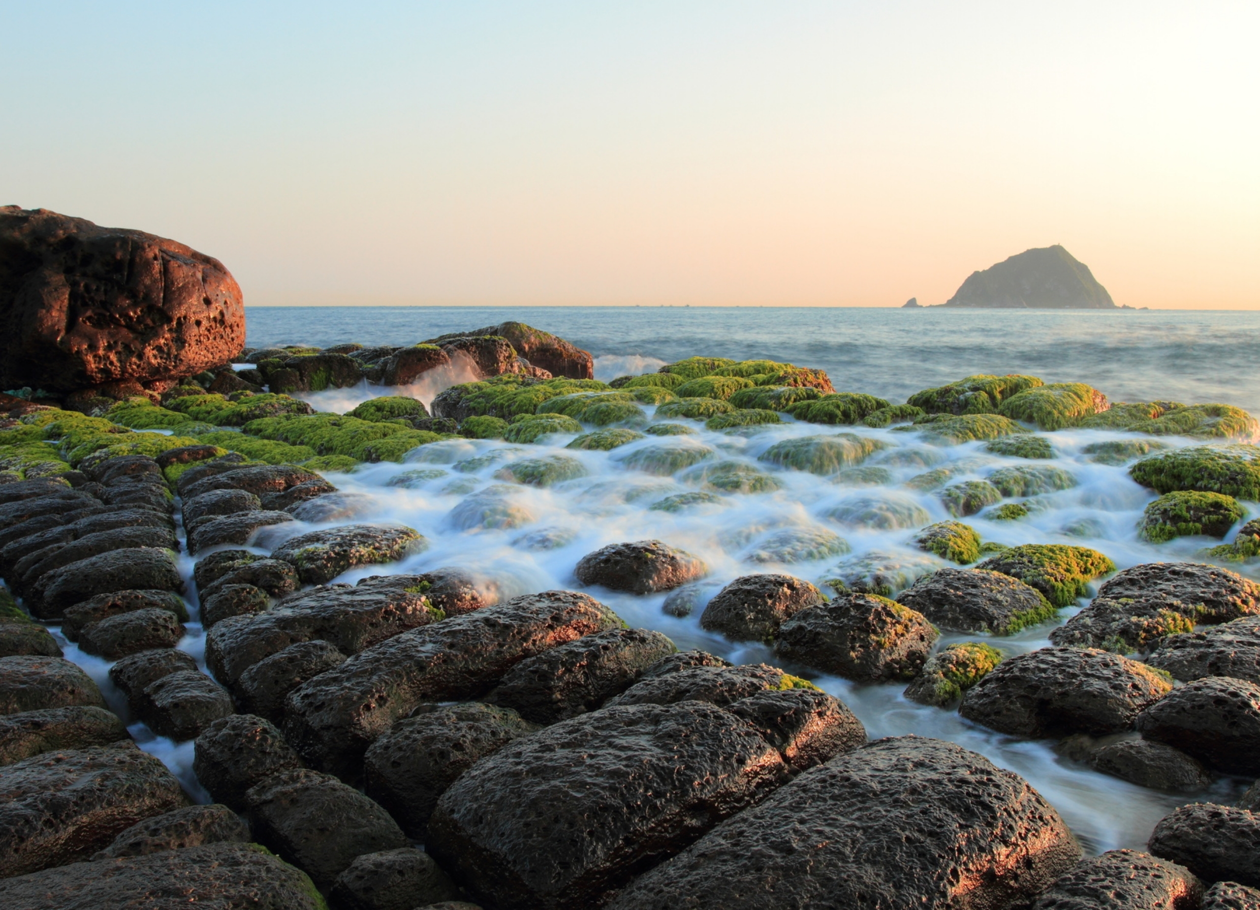 Description: A rocky beach with a large amount of water coming out of it and a rock formation in the background.
