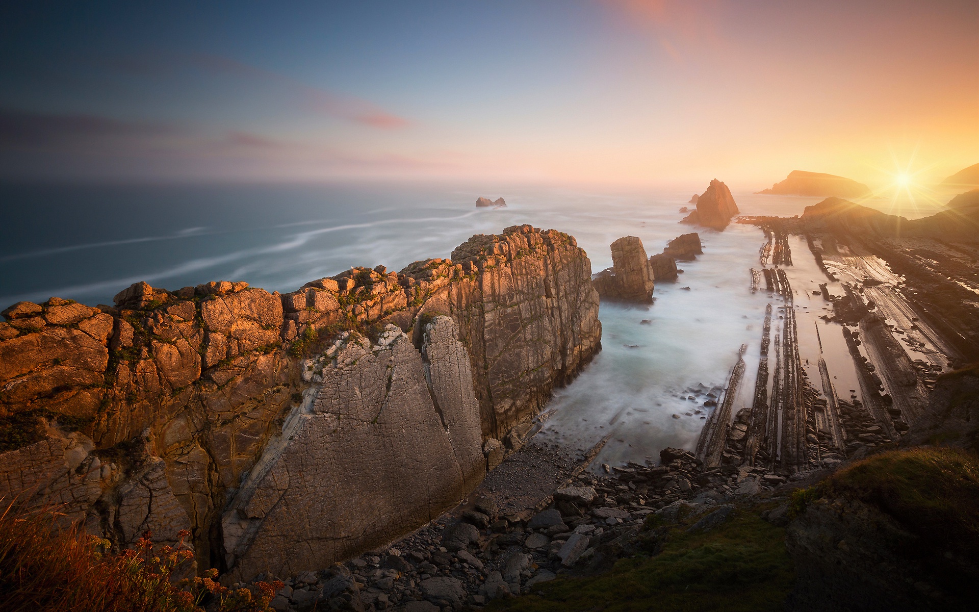 Description: A rocky cliff with a body of water in the foreground and a sunset in the background with a few rocks in the foreground.