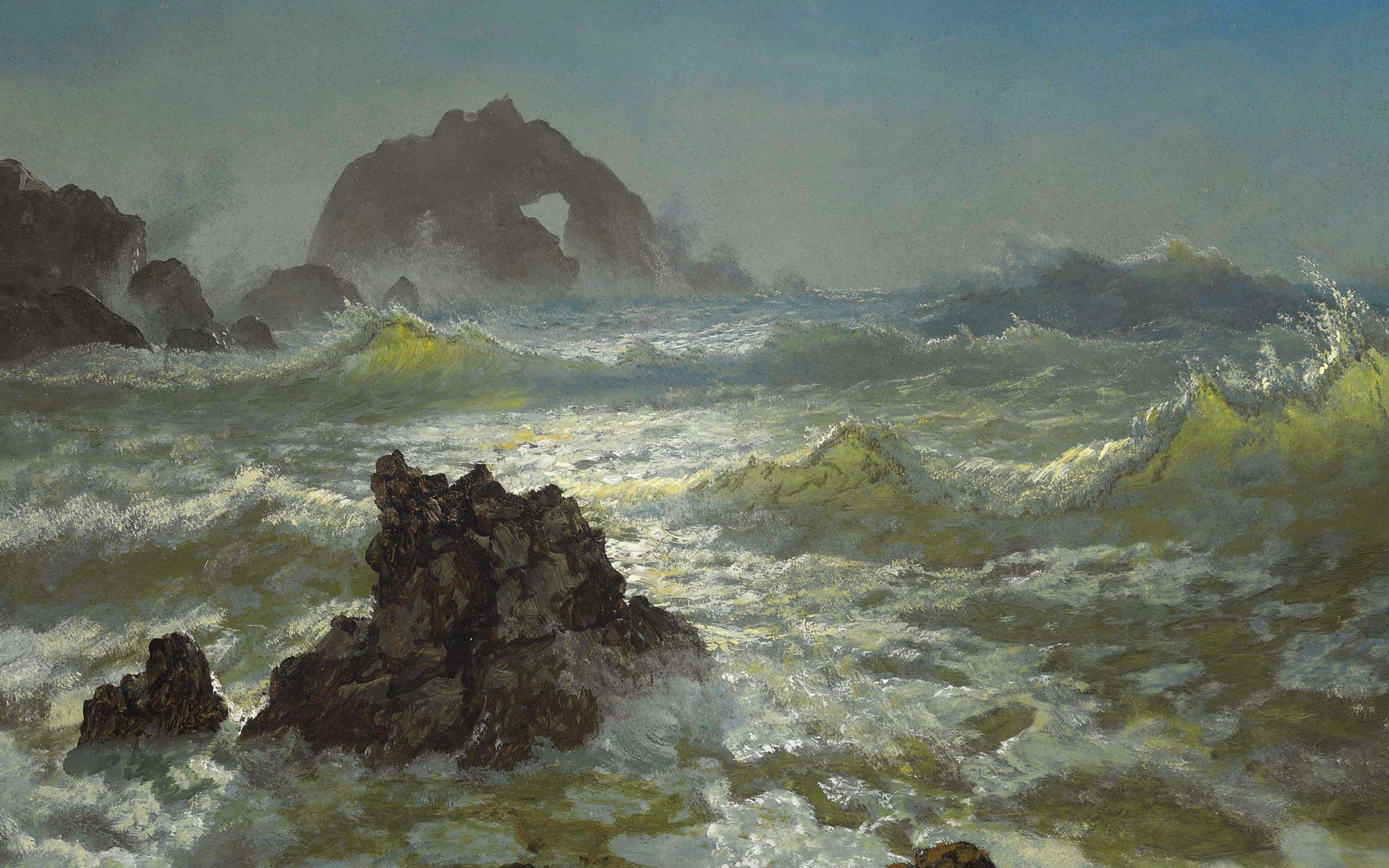 Description: A painting of a rocky coast with waves crashing against rocks and a large rock formation in the distance with a blue sky.
