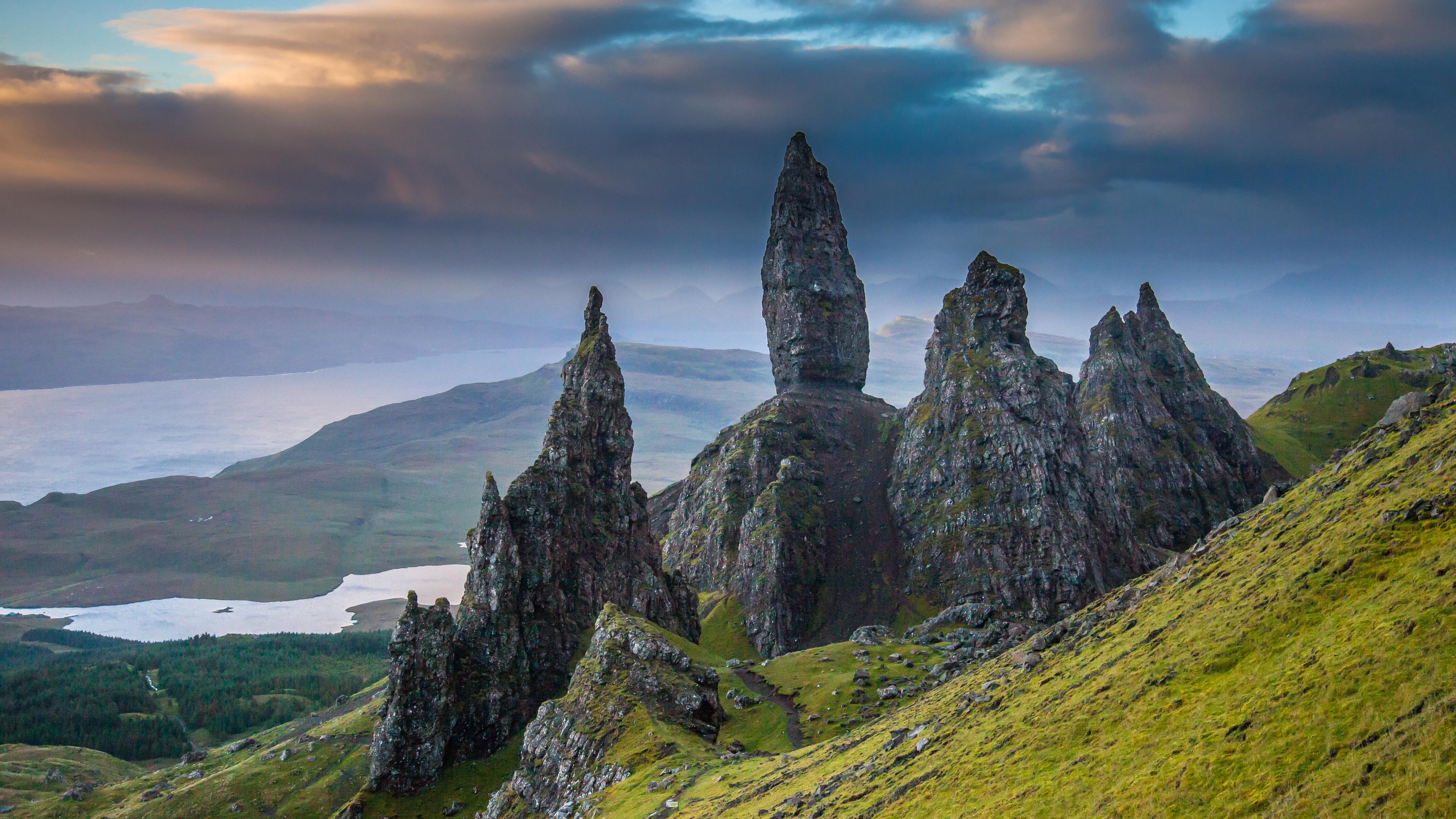 Description: A group of rocks on a grassy hill with a lake in the distance and a cloudy sky above them.