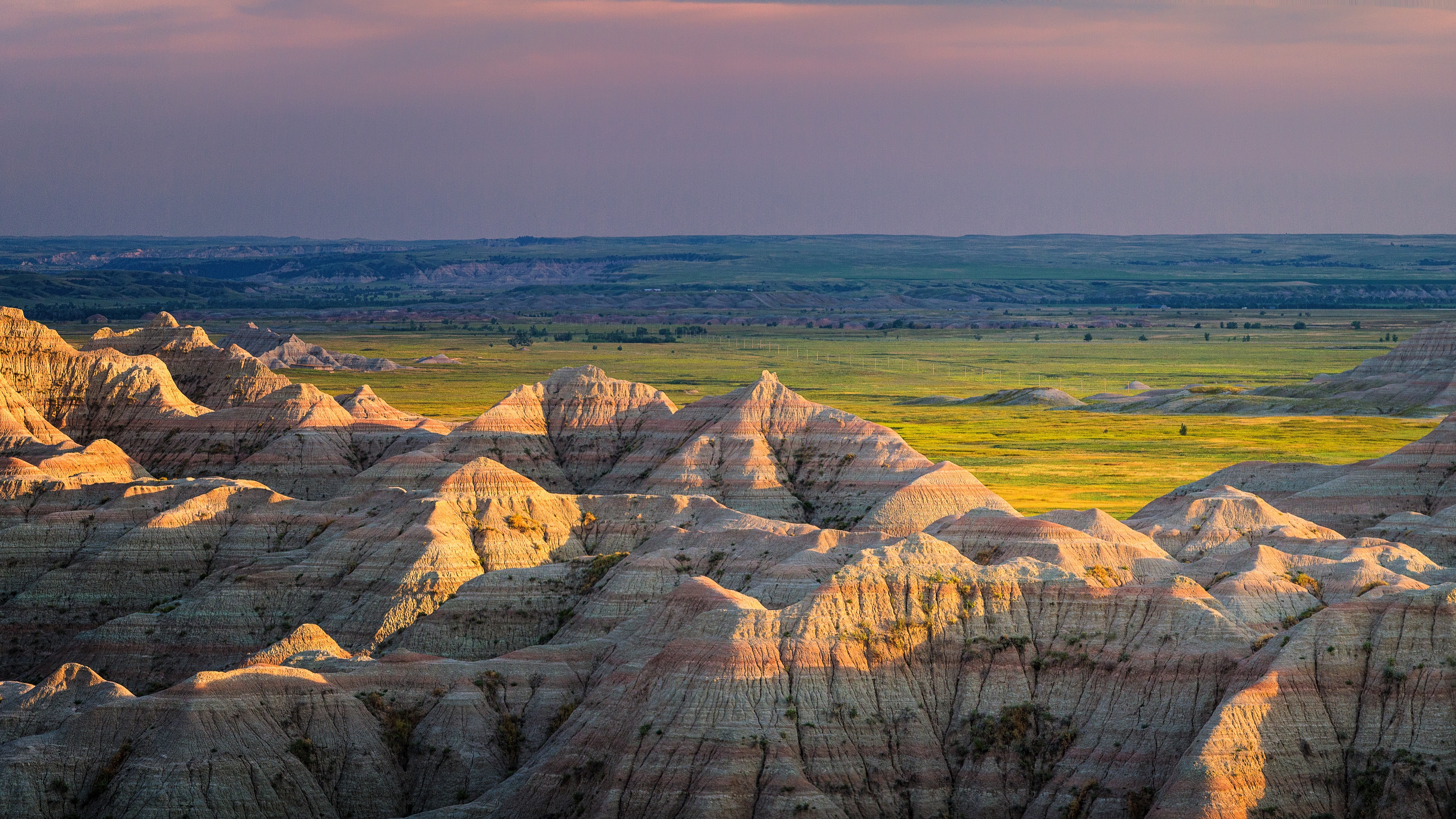 Description: A vast expanse of rocky hills with a sunset in the background and a distant valley in the foreground.