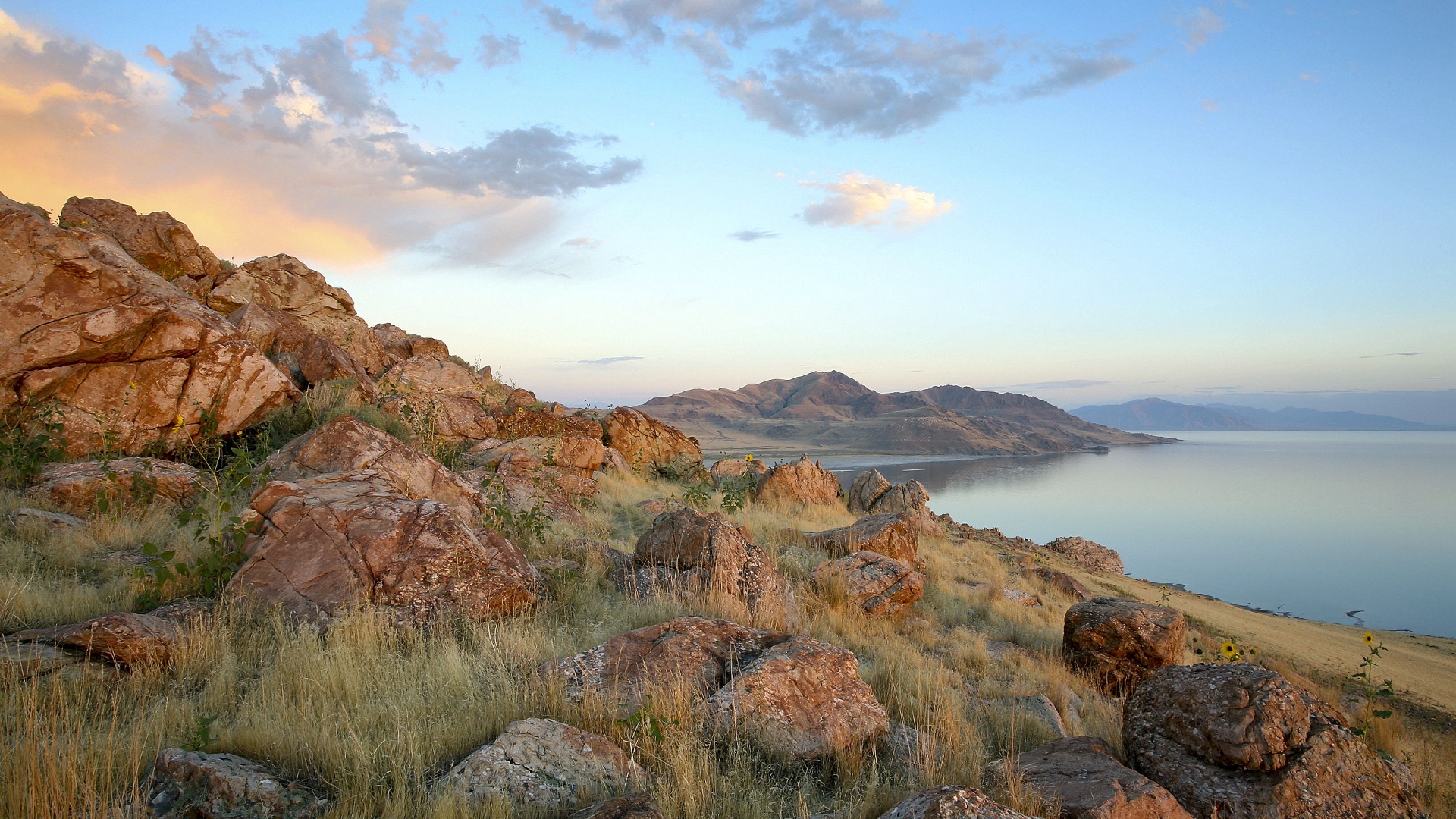 Description: A rocky hillside with a lake in the distance and a few clouds in the sky above it and a few grass growing on the ground.